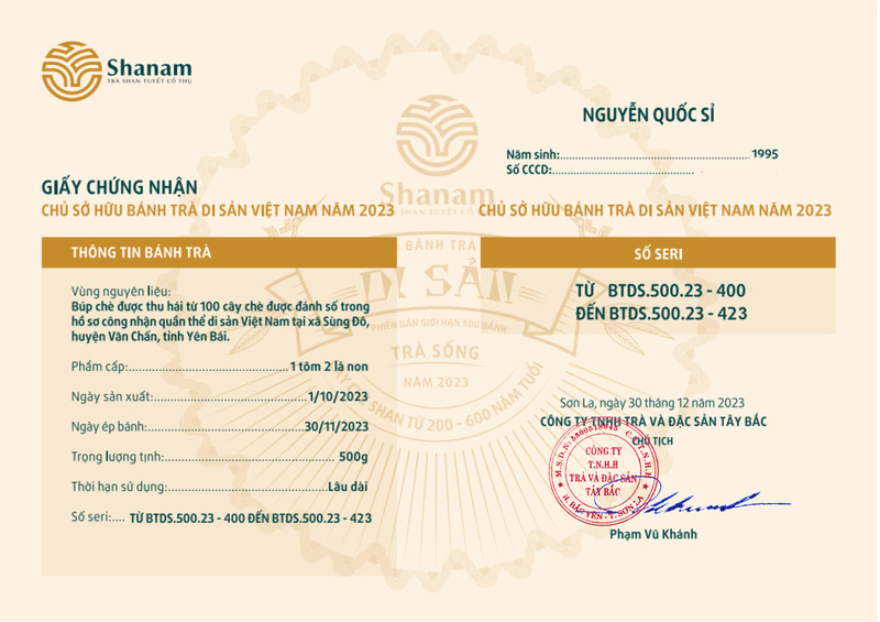Bánh trà Di sản Việt Nam năm 2023 sản xuất số lượng giới hạn 500 bánh, được đánh mã số từng bánh trà theo thứ tự từ 1 – 500 và có chữ ký trực tiếp của người sáng lập thương hiệu trà Shanam Phạm Vũ Khánh trên từng bánh trà. Mỗi bánh trà có QR riêng truy suất về website www.shanam.com.vn chứng minh chủ sở hữu của bánh trà.