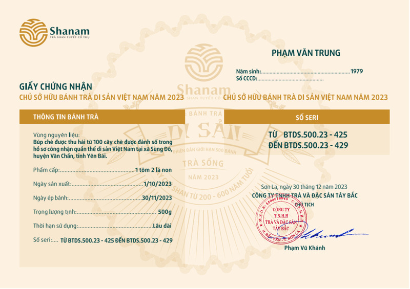 Bánh trà Di sản Việt Nam năm 2023 sản xuất số lượng giới hạn 500 bánh, được đánh mã số từng bánh trà theo thứ tự từ 1 – 500 và có chữ ký trực tiếp của người sáng lập thương hiệu trà Shanam Phạm Vũ Khánh trên từng bánh trà. Mỗi bánh trà có QR riêng truy suất về website www.shanam.com.vn chứng minh chủ sở hữu của bánh trà.