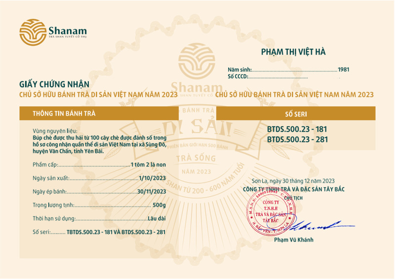Bánh trà Di sản Việt Nam năm 2023 sản xuất số lượng giới hạn 500 bánh, được đánh mã số từng bánh trà theo thứ tự từ 1 – 500 và có chữ ký trực tiếp của người sáng lập thương hiệu trà Shanam Phạm Vũ Khánh trên từng bánh trà. Mỗi bánh trà có QR riêng truy suất về website www.shanam.com.vn chứng minh chủ sở hữu của bánh trà.