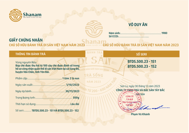 Bánh trà Di sản Việt Nam năm 2023 sản xuất số lượng giới hạn 500 bánh, được đánh mã số từng bánh trà theo thứ tự từ 1 – 500 và có chữ ký trực tiếp của người sáng lập thương hiệu trà Shanam Phạm Vũ Khánh trên từng bánh trà. Mỗi bánh trà có QR riêng truy suất về website www.shanam.com.vn chứng minh chủ sở hữu của bánh trà.