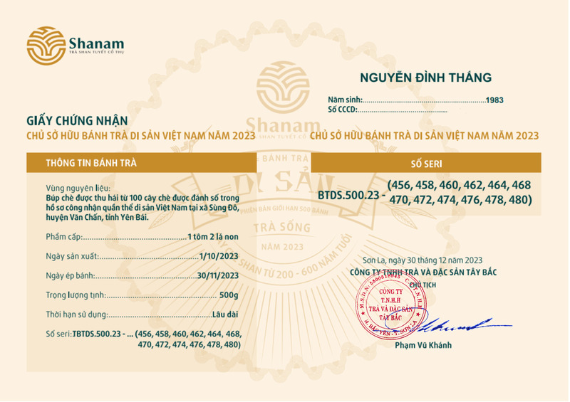 Bánh trà Di sản Việt Nam năm 2023 sản xuất số lượng giới hạn 500 bánh, được đánh mã số từng bánh trà theo thứ tự từ 1 – 500 và có chữ ký trực tiếp của người sáng lập thương hiệu trà Shanam Phạm Vũ Khánh trên từng bánh trà. Mỗi bánh trà có QR riêng truy suất về website www.shanam.com.vn chứng minh chủ sở hữu của bánh trà.