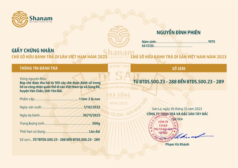 Bánh trà Di sản Việt Nam năm 2023 sản xuất số lượng giới hạn 500 bánh, được đánh mã số từng bánh trà theo thứ tự từ 1 – 500 và có chữ ký trực tiếp của người sáng lập thương hiệu trà Shanam Phạm Vũ Khánh trên từng bánh trà. Mỗi bánh trà có QR riêng truy suất về website www.shanam.com.vn chứng minh chủ sở hữu của bánh trà.