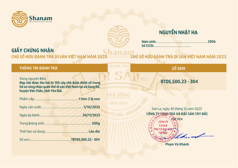 Bánh trà Di sản Việt Nam năm 2023 sản xuất số lượng giới hạn 500 bánh, được đánh mã số từng bánh trà theo thứ tự từ 1 – 500 và có chữ ký trực tiếp của người sáng lập thương hiệu trà Shanam Phạm Vũ Khánh trên từng bánh trà. Mỗi bánh trà có QR riêng truy suất về website www.shanam.com.vn chứng minh chủ sở hữu của bánh trà.