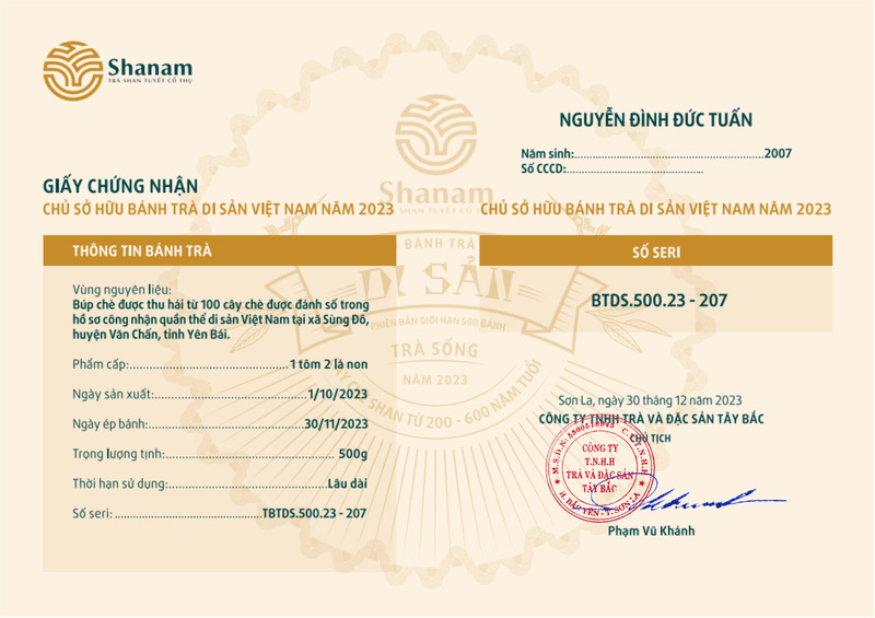 Bánh trà Di sản Việt Nam năm 2023 sản xuất số lượng giới hạn 500 bánh, được đánh mã số từng bánh trà theo thứ tự từ 1 – 500 và có chữ ký trực tiếp của người sáng lập thương hiệu trà Shanam Phạm Vũ Khánh trên từng bánh trà. Mỗi bánh trà có QR riêng truy suất về website www.shanam.com.vn chứng minh chủ sở hữu của bánh trà.