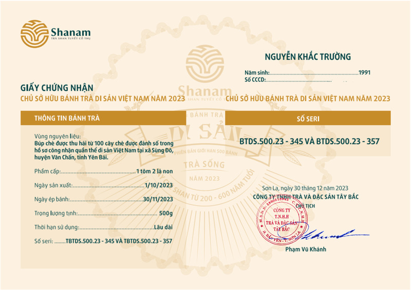 Bánh trà Di sản Việt Nam năm 2023 sản xuất số lượng giới hạn 500 bánh, được đánh mã số từng bánh trà theo thứ tự từ 1 – 500 và có chữ ký trực tiếp của người sáng lập thương hiệu trà Shanam Phạm Vũ Khánh trên từng bánh trà. Mỗi bánh trà có QR riêng truy suất về website www.shanam.com.vn chứng minh chủ sở hữu của bánh trà.