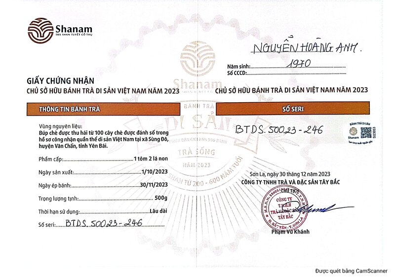 Bánh trà Di sản Việt Nam năm 2023 sản xuất số lượng giới hạn 500 bánh, được đánh mã số từng bánh trà theo thứ tự từ 1 – 500 và có chữ ký trực tiếp của người sáng lập thương hiệu trà Shanam Phạm Vũ Khánh trên từng bánh trà. Mỗi bánh trà có QR riêng truy suất về website www.shanam.com.vn chứng minh chủ sở hữu của bánh trà.