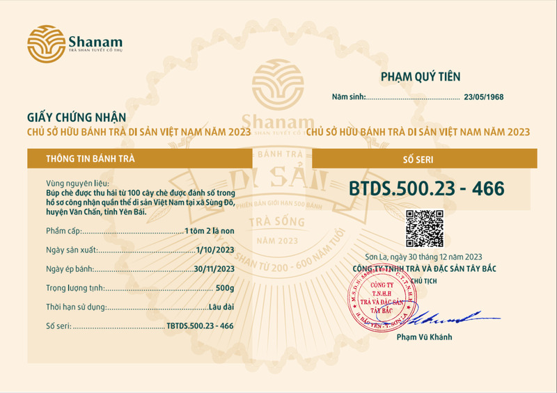 Bánh trà Di sản Việt Nam năm 2023 sản xuất số lượng giới hạn 500 bánh, được đánh mã số từng bánh trà theo thứ tự từ 1 – 500 và có chữ ký trực tiếp của người sáng lập thương hiệu trà Shanam Phạm Vũ Khánh trên từng bánh trà. Mỗi bánh trà có QR riêng truy suất về website www.shanam.com.vn chứng minh chủ sở hữu của bánh trà.