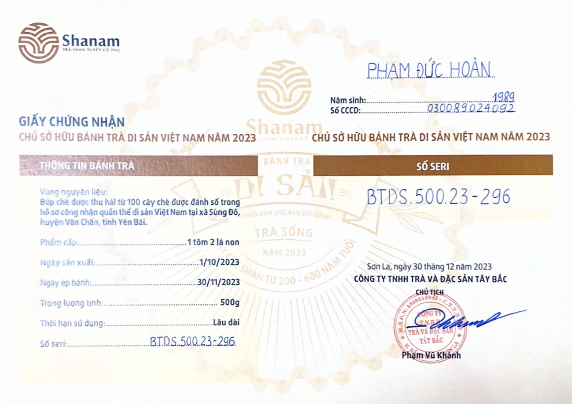 Bánh trà Di sản Việt Nam năm 2023 sản xuất số lượng giới hạn 500 bánh, được đánh mã số từng bánh trà theo thứ tự từ 1 – 500 và có chữ ký trực tiếp của người sáng lập thương hiệu trà Shanam Phạm Vũ Khánh trên từng bánh trà. Mỗi bánh trà có QR riêng truy suất về website www.shanam.com.vn chứng minh chủ sở hữu của bánh trà.