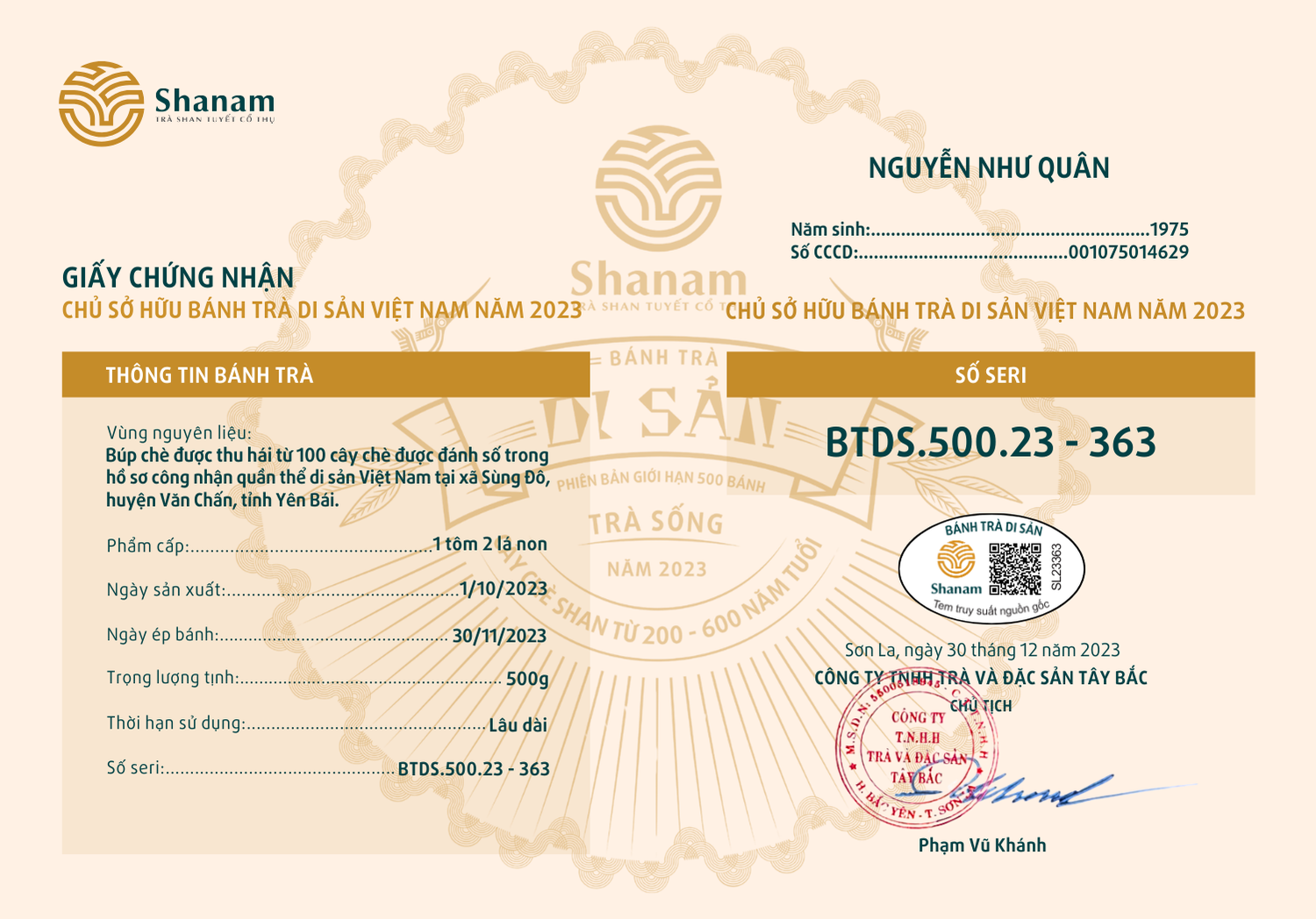 Bánh trà Di sản Việt Nam năm 2023 sản xuất số lượng giới hạn 500 bánh, được đánh mã số từng bánh trà theo thứ tự từ 1 – 500 và có chữ ký trực tiếp của người sáng lập thương hiệu trà Shanam Phạm Vũ Khánh trên từng bánh trà. Mỗi bánh trà có QR riêng truy suất về website www.shanam.com.vn chứng minh chủ sở hữu của bánh trà.