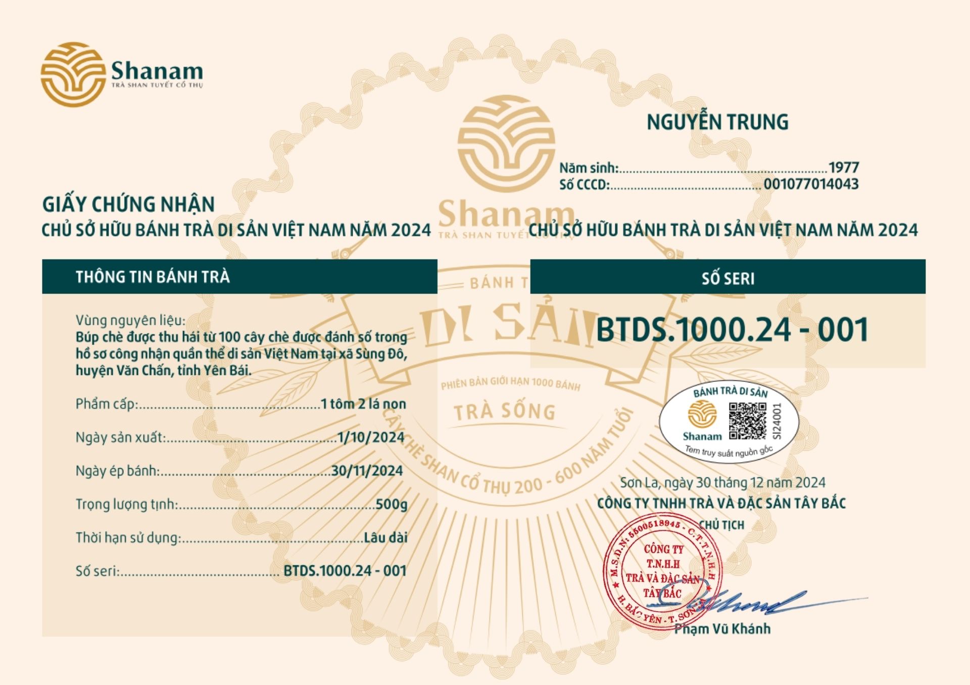 Bánh trà Di sản Việt Nam năm 2023 sản xuất số lượng giới hạn 500 bánh, được đánh mã số từng bánh trà theo thứ tự từ 1 – 500 và có chữ ký trực tiếp của người sáng lập thương hiệu trà Shanam Phạm Vũ Khánh trên từng bánh trà. Mỗi bánh trà có QR riêng truy suất về website www.shanam.com.vn chứng minh chủ sở hữu của bánh trà.