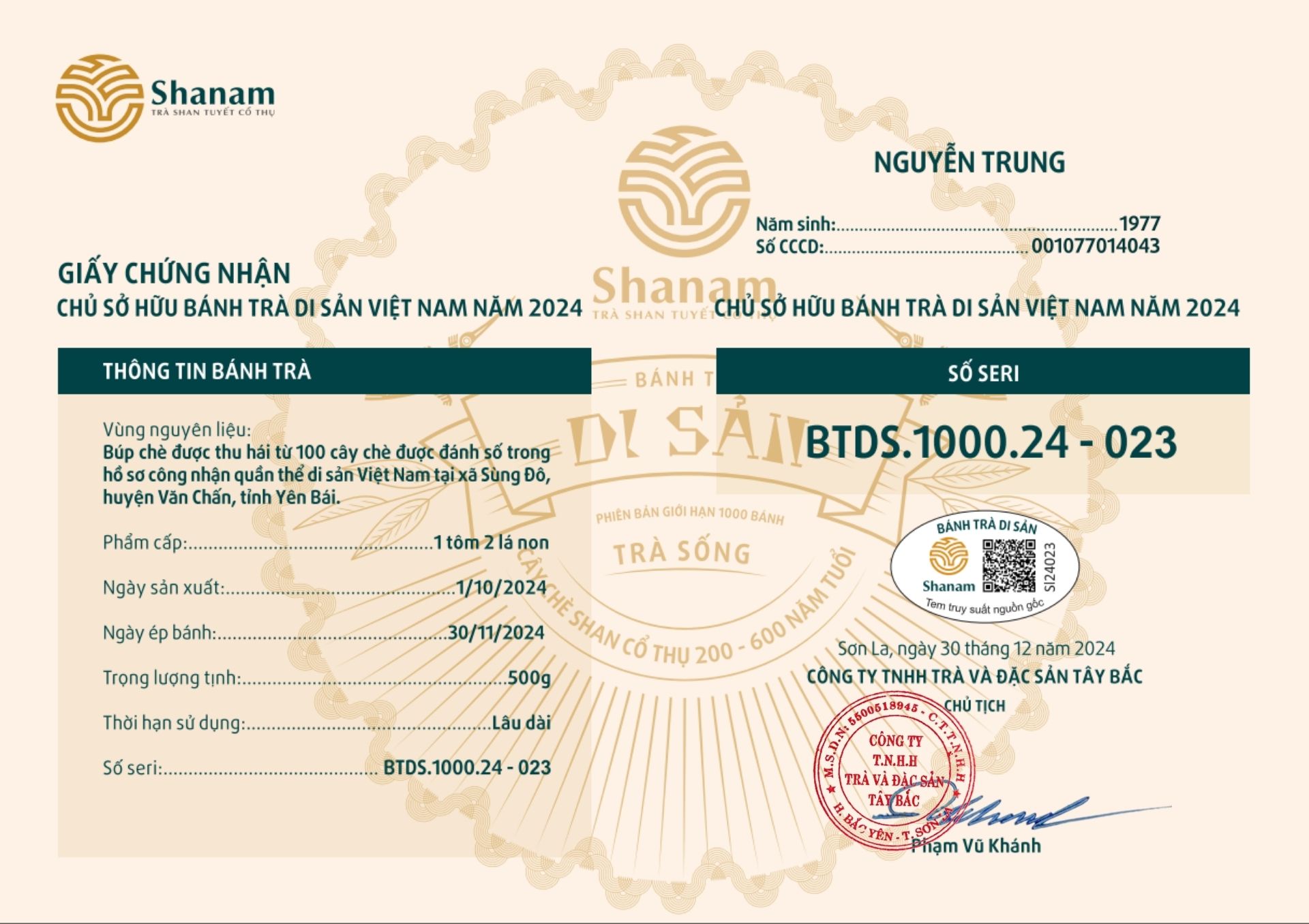 Bánh trà Di sản Việt Nam năm 2023 sản xuất số lượng giới hạn 500 bánh, được đánh mã số từng bánh trà theo thứ tự từ 1 – 500 và có chữ ký trực tiếp của người sáng lập thương hiệu trà Shanam Phạm Vũ Khánh trên từng bánh trà. Mỗi bánh trà có QR riêng truy suất về website www.shanam.com.vn chứng minh chủ sở hữu của bánh trà.