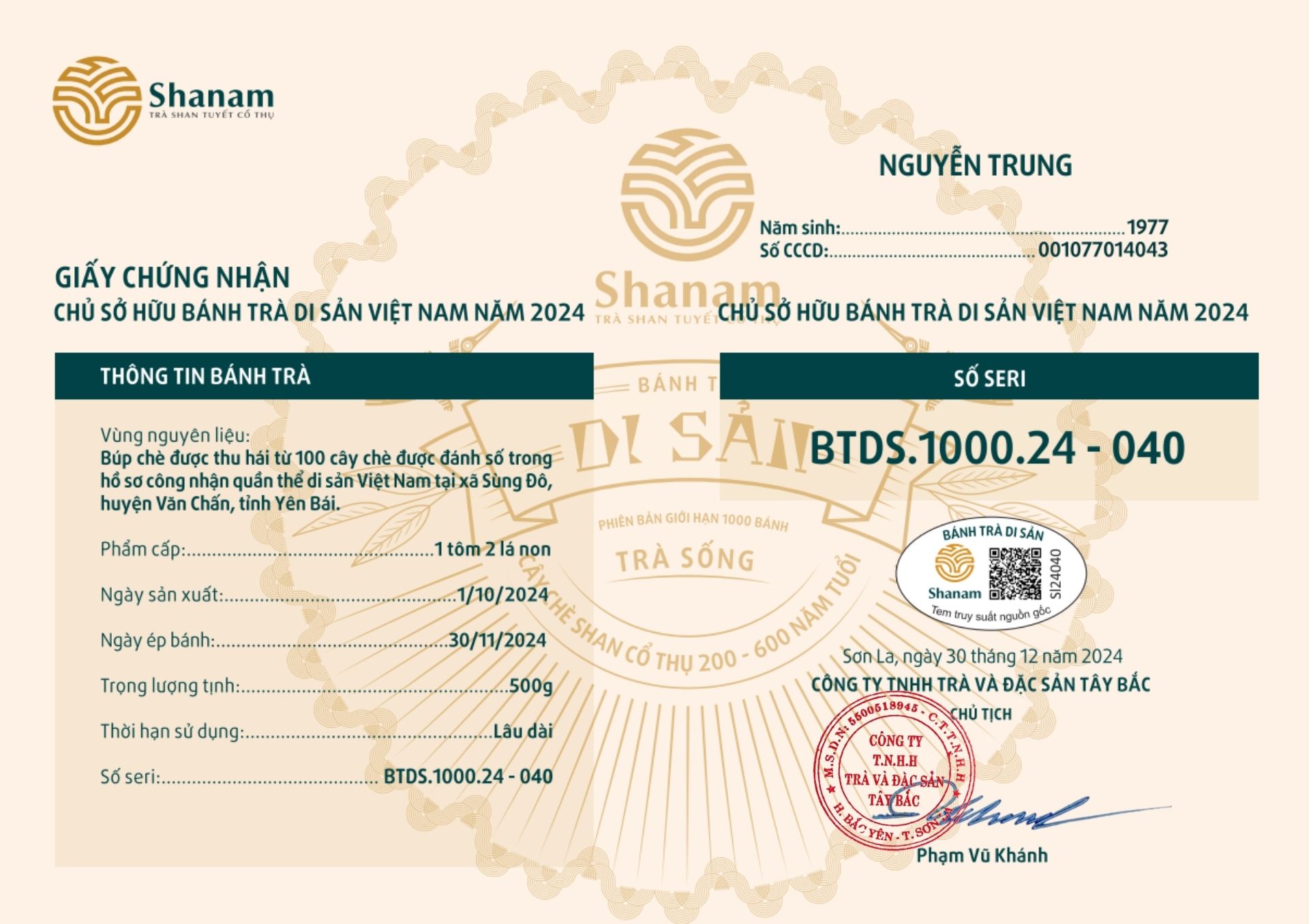 Bánh trà Di sản Việt Nam năm 2023 sản xuất số lượng giới hạn 500 bánh, được đánh mã số từng bánh trà theo thứ tự từ 1 – 500 và có chữ ký trực tiếp của người sáng lập thương hiệu trà Shanam Phạm Vũ Khánh trên từng bánh trà. Mỗi bánh trà có QR riêng truy suất về website www.shanam.com.vn chứng minh chủ sở hữu của bánh trà.