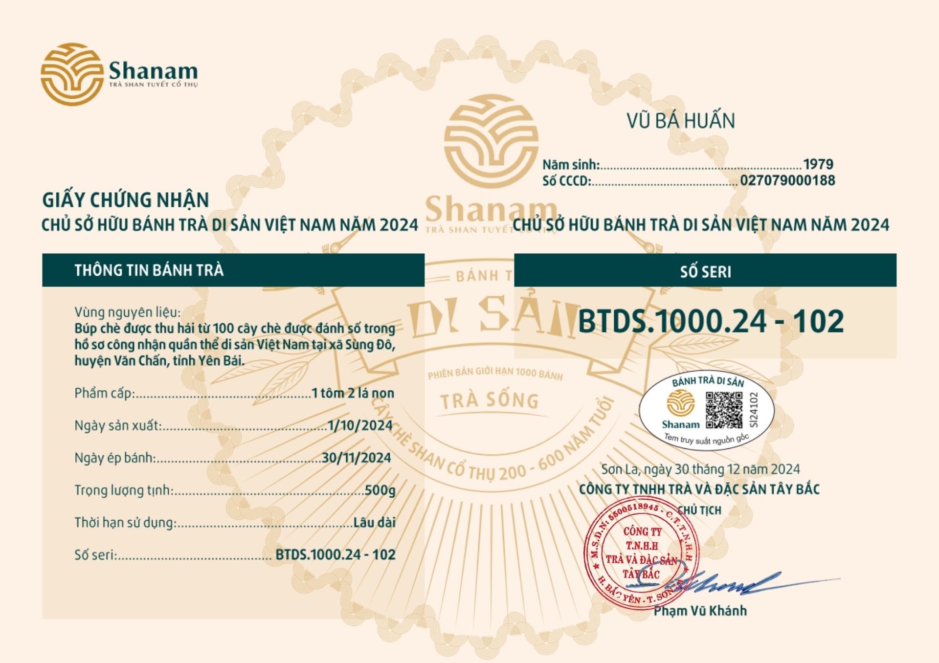 Bánh trà Di sản Việt Nam năm 2023 sản xuất số lượng giới hạn 500 bánh, được đánh mã số từng bánh trà theo thứ tự từ 1 – 500 và có chữ ký trực tiếp của người sáng lập thương hiệu trà Shanam Phạm Vũ Khánh trên từng bánh trà. Mỗi bánh trà có QR riêng truy suất về website www.shanam.com.vn chứng minh chủ sở hữu của bánh trà.