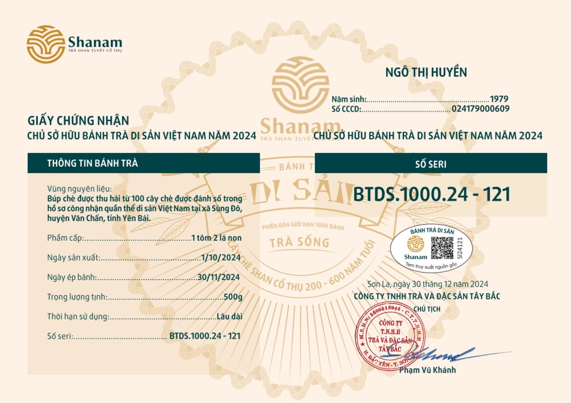 Bánh trà Di sản Việt Nam năm 2023 sản xuất số lượng giới hạn 500 bánh, được đánh mã số từng bánh trà theo thứ tự từ 1 – 500 và có chữ ký trực tiếp của người sáng lập thương hiệu trà Shanam Phạm Vũ Khánh trên từng bánh trà. Mỗi bánh trà có QR riêng truy suất về website www.shanam.com.vn chứng minh chủ sở hữu của bánh trà.