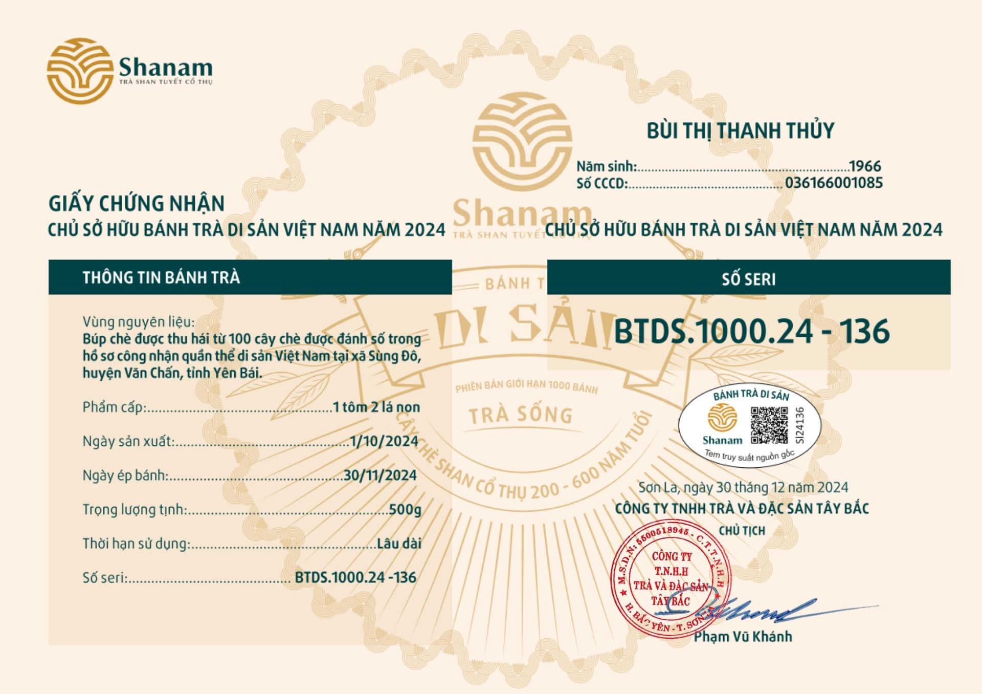 Bánh trà Di sản Việt Nam năm 2023 sản xuất số lượng giới hạn 500 bánh, được đánh mã số từng bánh trà theo thứ tự từ 1 – 500 và có chữ ký trực tiếp của người sáng lập thương hiệu trà Shanam Phạm Vũ Khánh trên từng bánh trà. Mỗi bánh trà có QR riêng truy suất về website www.shanam.com.vn chứng minh chủ sở hữu của bánh trà.