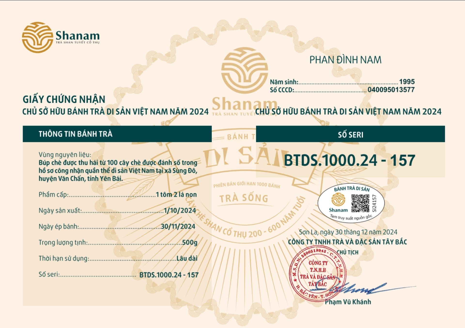 Bánh trà Di sản Việt Nam năm 2023 sản xuất số lượng giới hạn 500 bánh, được đánh mã số từng bánh trà theo thứ tự từ 1 – 500 và có chữ ký trực tiếp của người sáng lập thương hiệu trà Shanam Phạm Vũ Khánh trên từng bánh trà. Mỗi bánh trà có QR riêng truy suất về website www.shanam.com.vn chứng minh chủ sở hữu của bánh trà.