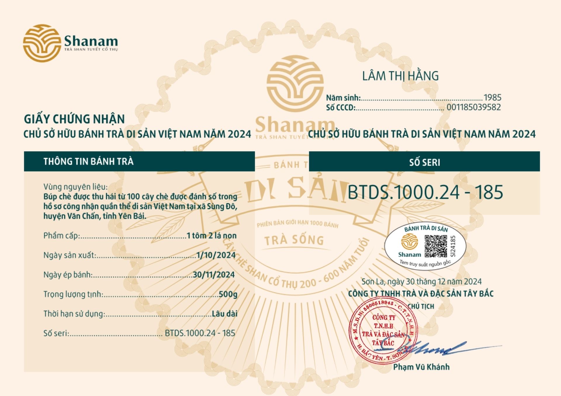 Bánh trà Di sản Việt Nam năm 2023 sản xuất số lượng giới hạn 500 bánh, được đánh mã số từng bánh trà theo thứ tự từ 1 – 500 và có chữ ký trực tiếp của người sáng lập thương hiệu trà Shanam Phạm Vũ Khánh trên từng bánh trà. Mỗi bánh trà có QR riêng truy suất về website www.shanam.com.vn chứng minh chủ sở hữu của bánh trà.