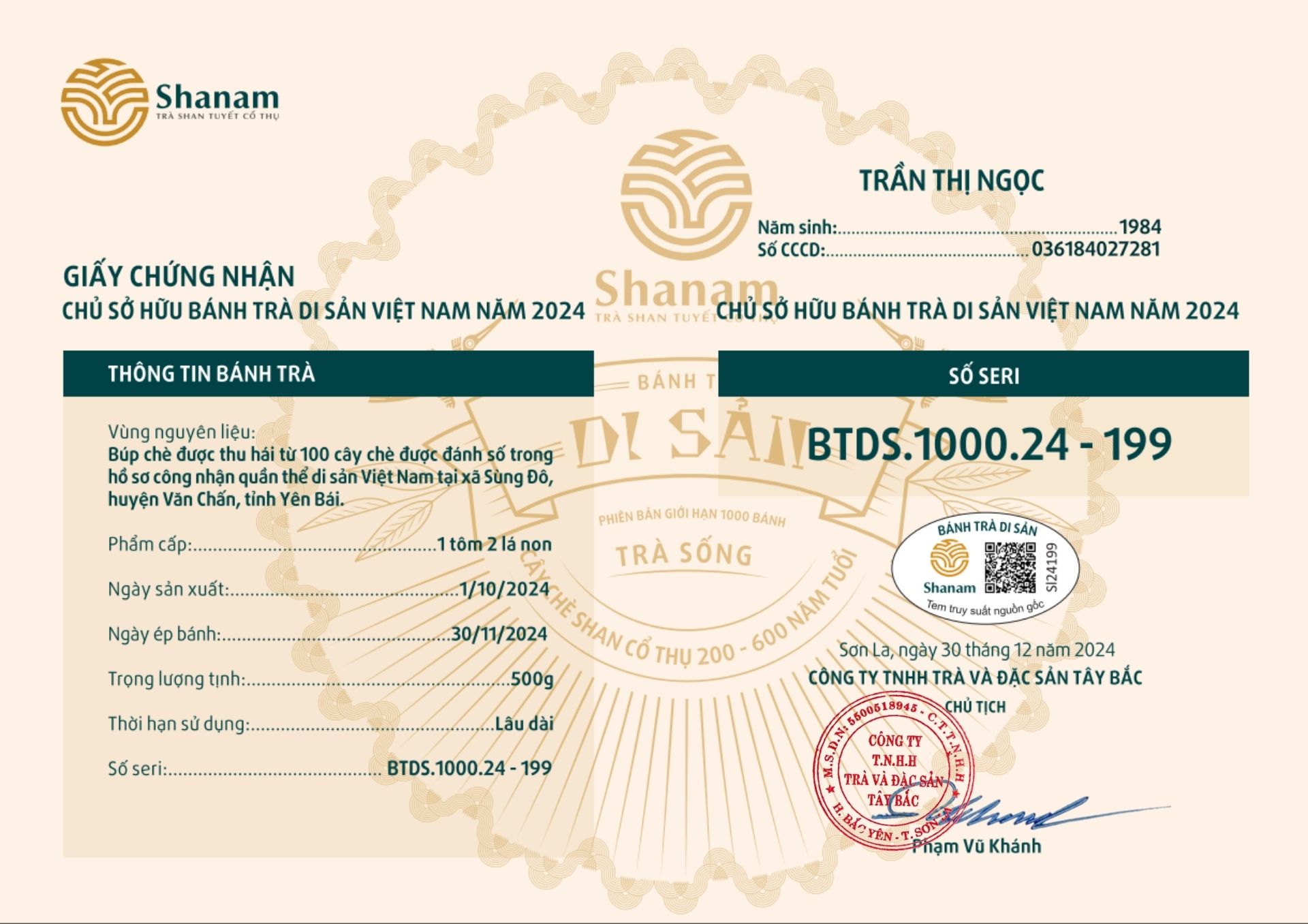 Bánh trà Di sản Việt Nam năm 2023 sản xuất số lượng giới hạn 500 bánh, được đánh mã số từng bánh trà theo thứ tự từ 1 – 500 và có chữ ký trực tiếp của người sáng lập thương hiệu trà Shanam Phạm Vũ Khánh trên từng bánh trà. Mỗi bánh trà có QR riêng truy suất về website www.shanam.com.vn chứng minh chủ sở hữu của bánh trà.