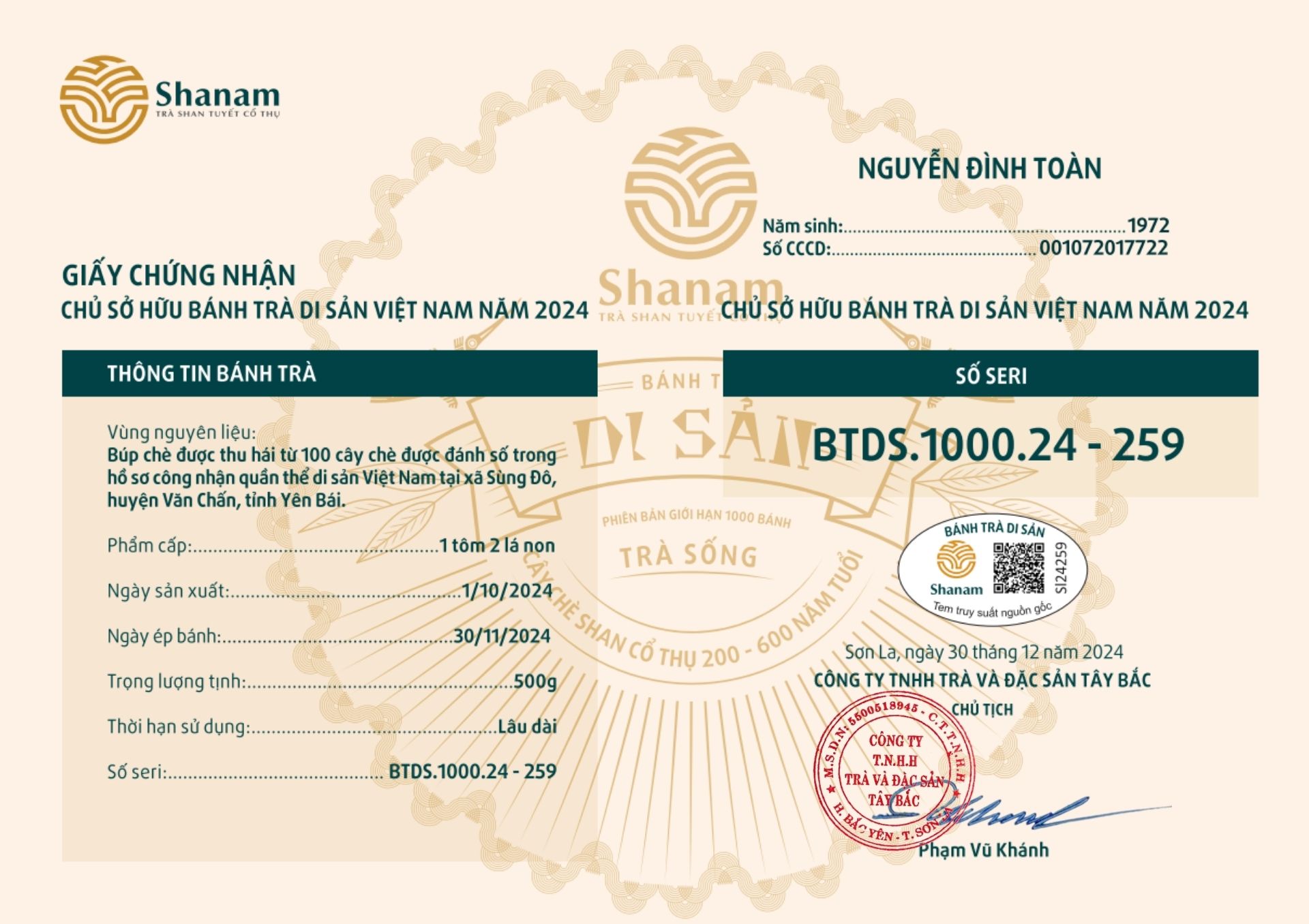 Bánh trà Di sản Việt Nam năm 2023 sản xuất số lượng giới hạn 500 bánh, được đánh mã số từng bánh trà theo thứ tự từ 1 – 500 và có chữ ký trực tiếp của người sáng lập thương hiệu trà Shanam Phạm Vũ Khánh trên từng bánh trà. Mỗi bánh trà có QR riêng truy suất về website www.shanam.com.vn chứng minh chủ sở hữu của bánh trà.
