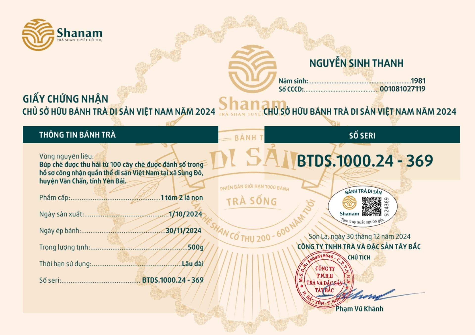 Bánh trà Di sản Việt Nam năm 2023 sản xuất số lượng giới hạn 500 bánh, được đánh mã số từng bánh trà theo thứ tự từ 1 – 500 và có chữ ký trực tiếp của người sáng lập thương hiệu trà Shanam Phạm Vũ Khánh trên từng bánh trà. Mỗi bánh trà có QR riêng truy suất về website www.shanam.com.vn chứng minh chủ sở hữu của bánh trà.