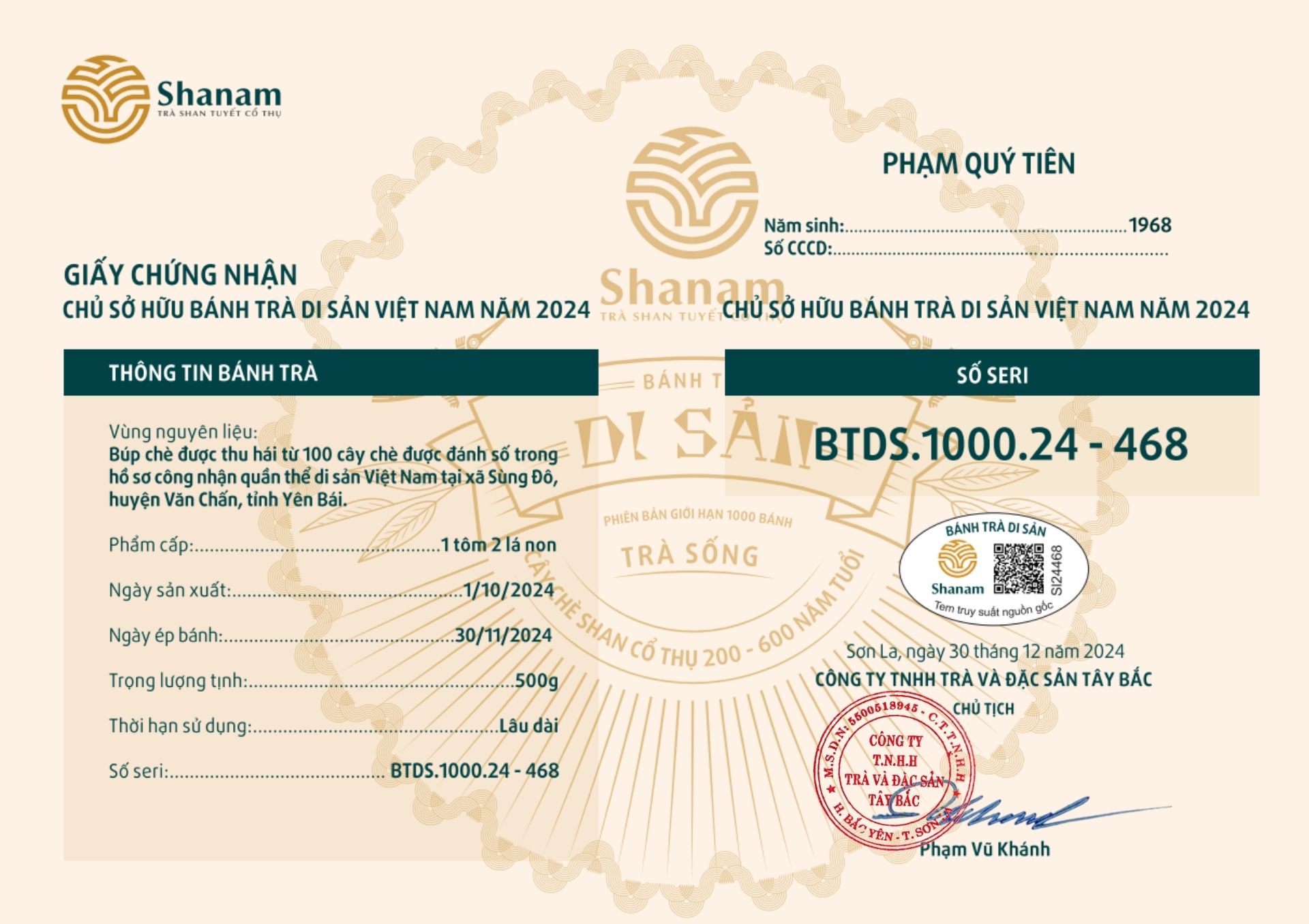 Bánh trà Di sản Việt Nam năm 2023 sản xuất số lượng giới hạn 500 bánh, được đánh mã số từng bánh trà theo thứ tự từ 1 – 500 và có chữ ký trực tiếp của người sáng lập thương hiệu trà Shanam Phạm Vũ Khánh trên từng bánh trà. Mỗi bánh trà có QR riêng truy suất về website www.shanam.com.vn chứng minh chủ sở hữu của bánh trà.