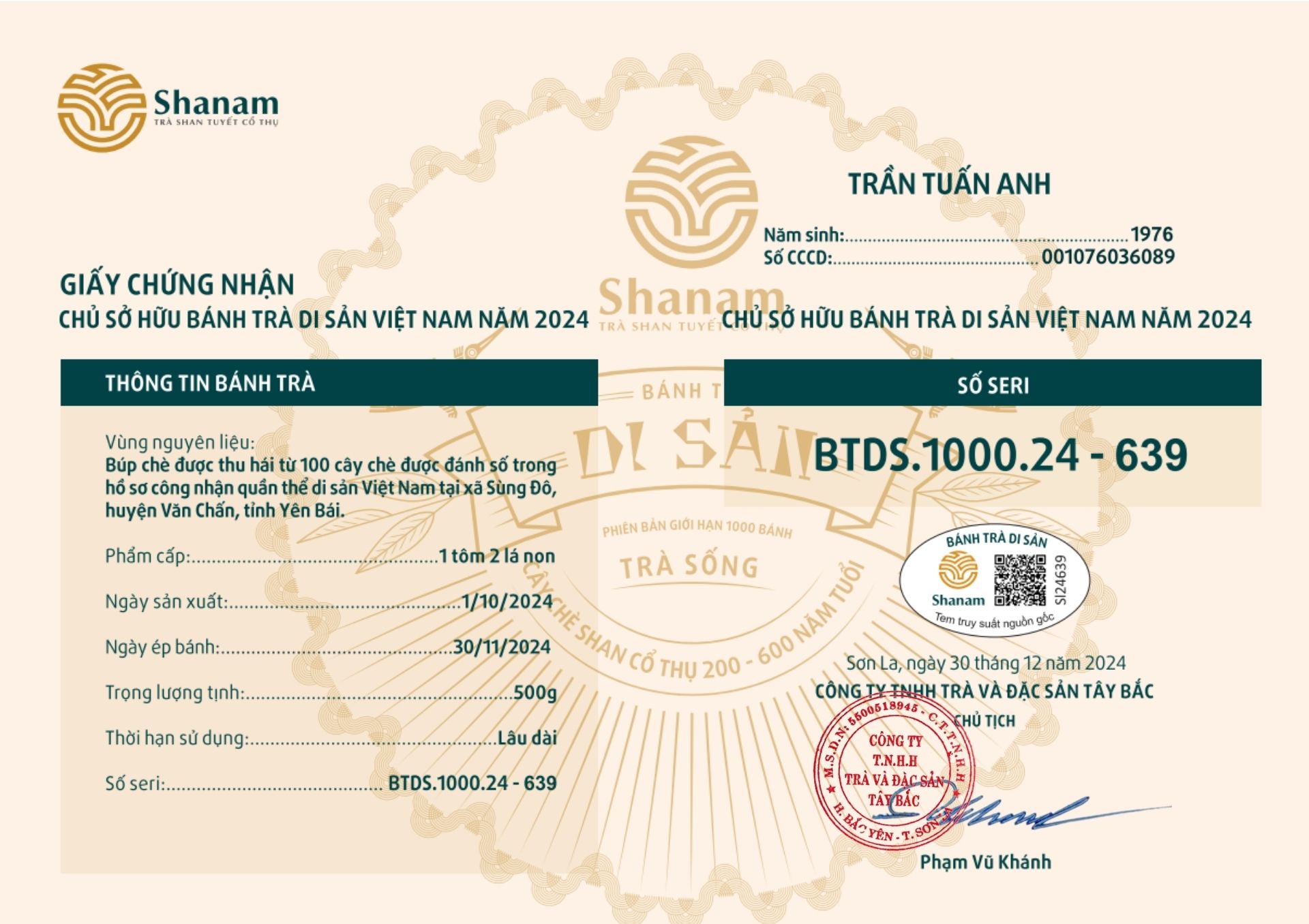 Bánh trà Di sản Việt Nam năm 2023 sản xuất số lượng giới hạn 500 bánh, được đánh mã số từng bánh trà theo thứ tự từ 1 – 500 và có chữ ký trực tiếp của người sáng lập thương hiệu trà Shanam Phạm Vũ Khánh trên từng bánh trà. Mỗi bánh trà có QR riêng truy suất về website www.shanam.com.vn chứng minh chủ sở hữu của bánh trà.