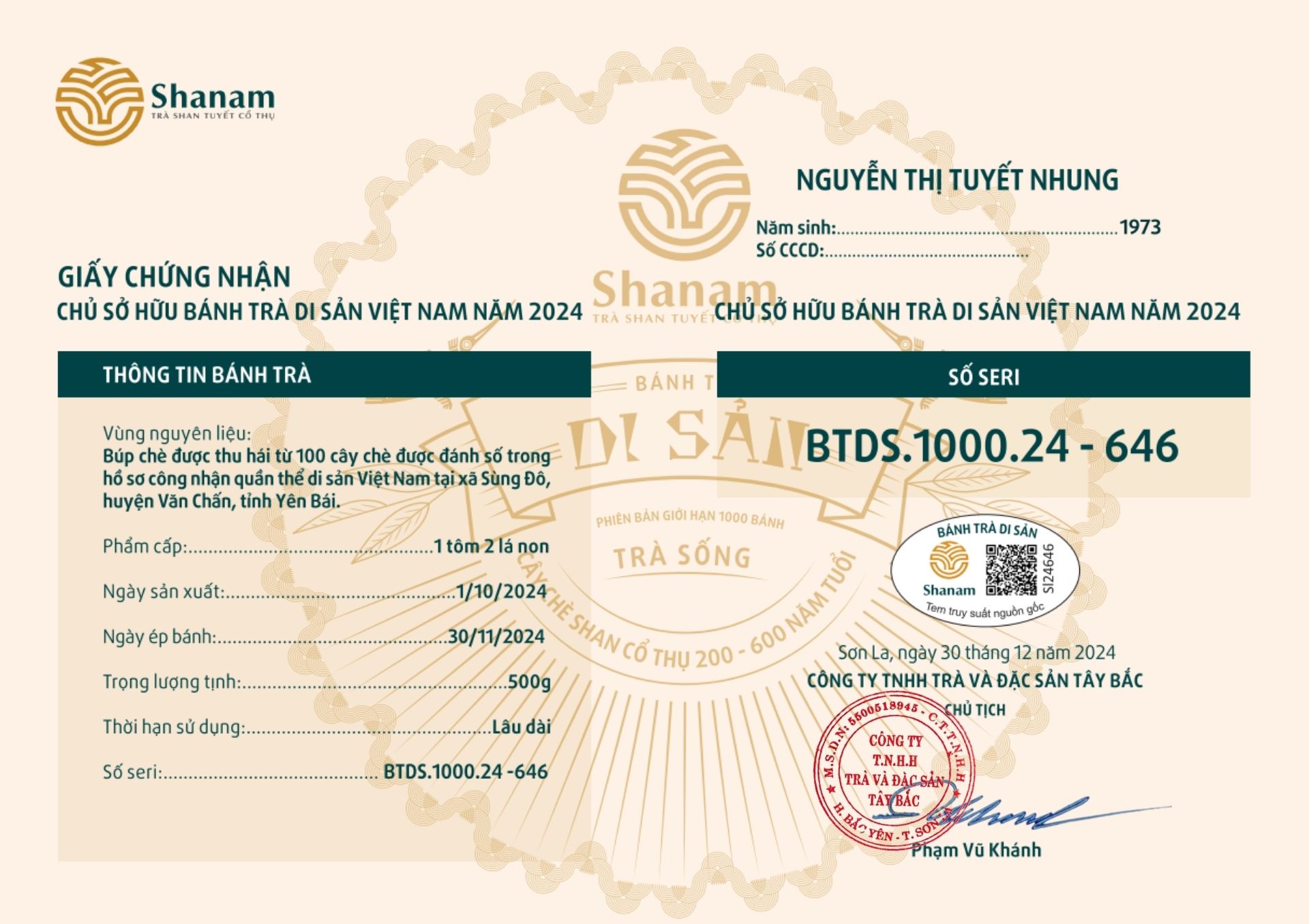 Bánh trà Di sản Việt Nam năm 2023 sản xuất số lượng giới hạn 500 bánh, được đánh mã số từng bánh trà theo thứ tự từ 1 – 500 và có chữ ký trực tiếp của người sáng lập thương hiệu trà Shanam Phạm Vũ Khánh trên từng bánh trà. Mỗi bánh trà có QR riêng truy suất về website www.shanam.com.vn chứng minh chủ sở hữu của bánh trà.