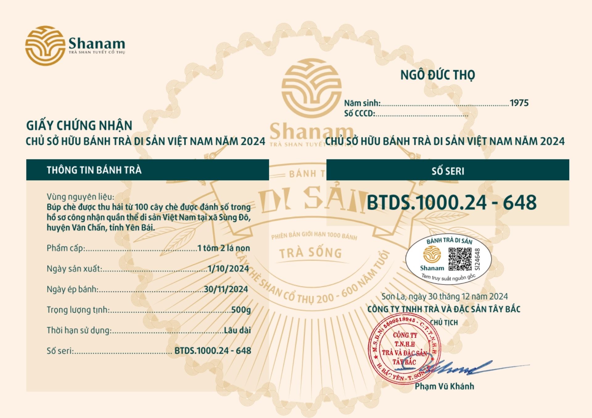Bánh trà Di sản Việt Nam năm 2023 sản xuất số lượng giới hạn 500 bánh, được đánh mã số từng bánh trà theo thứ tự từ 1 – 500 và có chữ ký trực tiếp của người sáng lập thương hiệu trà Shanam Phạm Vũ Khánh trên từng bánh trà. Mỗi bánh trà có QR riêng truy suất về website www.shanam.com.vn chứng minh chủ sở hữu của bánh trà.