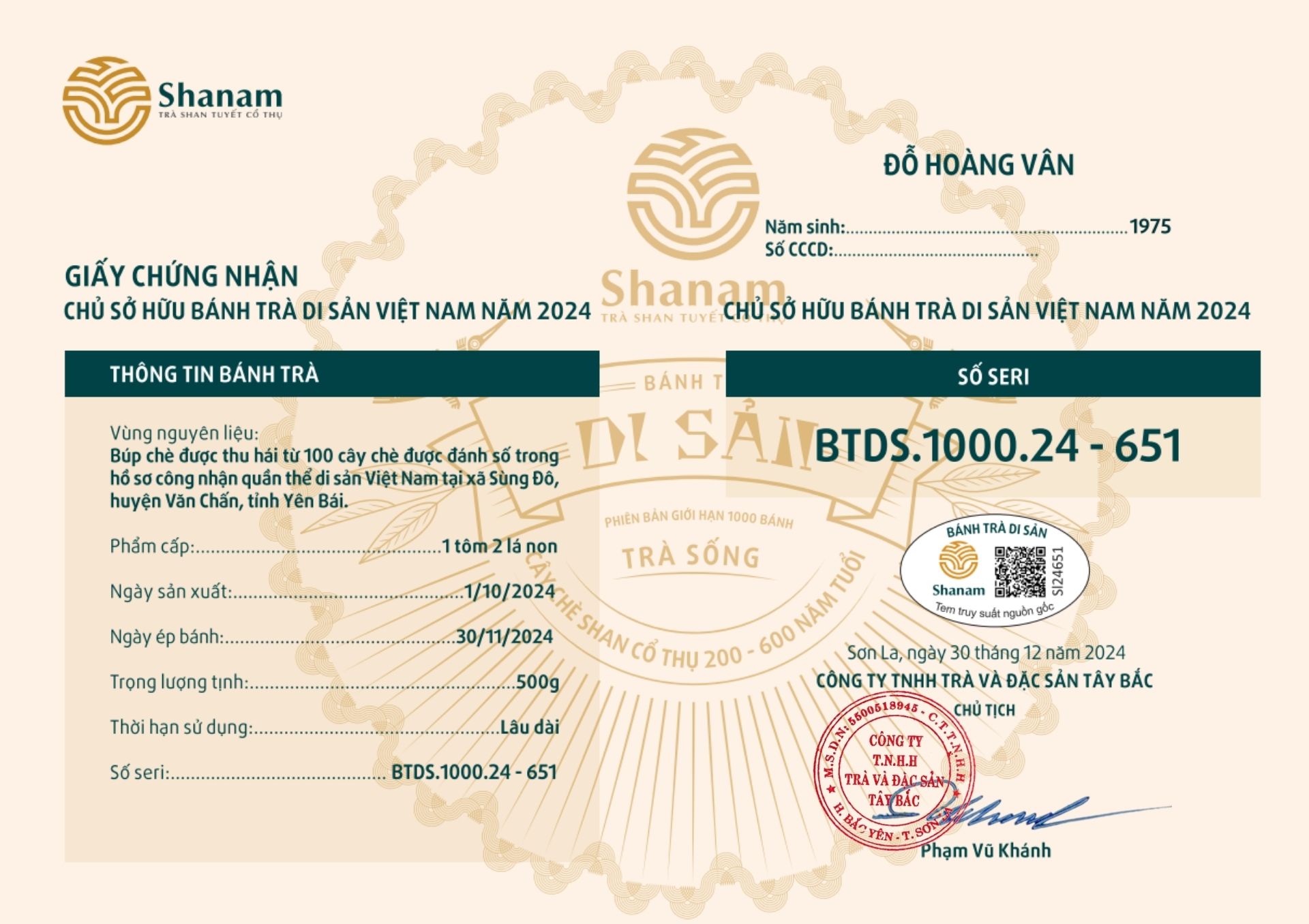 Bánh trà Di sản Việt Nam năm 2023 sản xuất số lượng giới hạn 500 bánh, được đánh mã số từng bánh trà theo thứ tự từ 1 – 500 và có chữ ký trực tiếp của người sáng lập thương hiệu trà Shanam Phạm Vũ Khánh trên từng bánh trà. Mỗi bánh trà có QR riêng truy suất về website www.shanam.com.vn chứng minh chủ sở hữu của bánh trà.