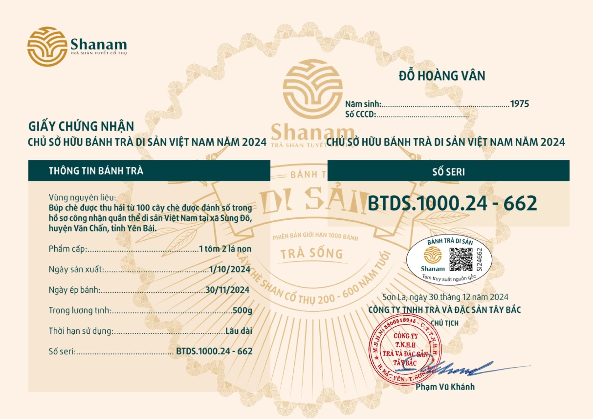 Bánh trà Di sản Việt Nam năm 2023 sản xuất số lượng giới hạn 500 bánh, được đánh mã số từng bánh trà theo thứ tự từ 1 – 500 và có chữ ký trực tiếp của người sáng lập thương hiệu trà Shanam Phạm Vũ Khánh trên từng bánh trà. Mỗi bánh trà có QR riêng truy suất về website www.shanam.com.vn chứng minh chủ sở hữu của bánh trà.