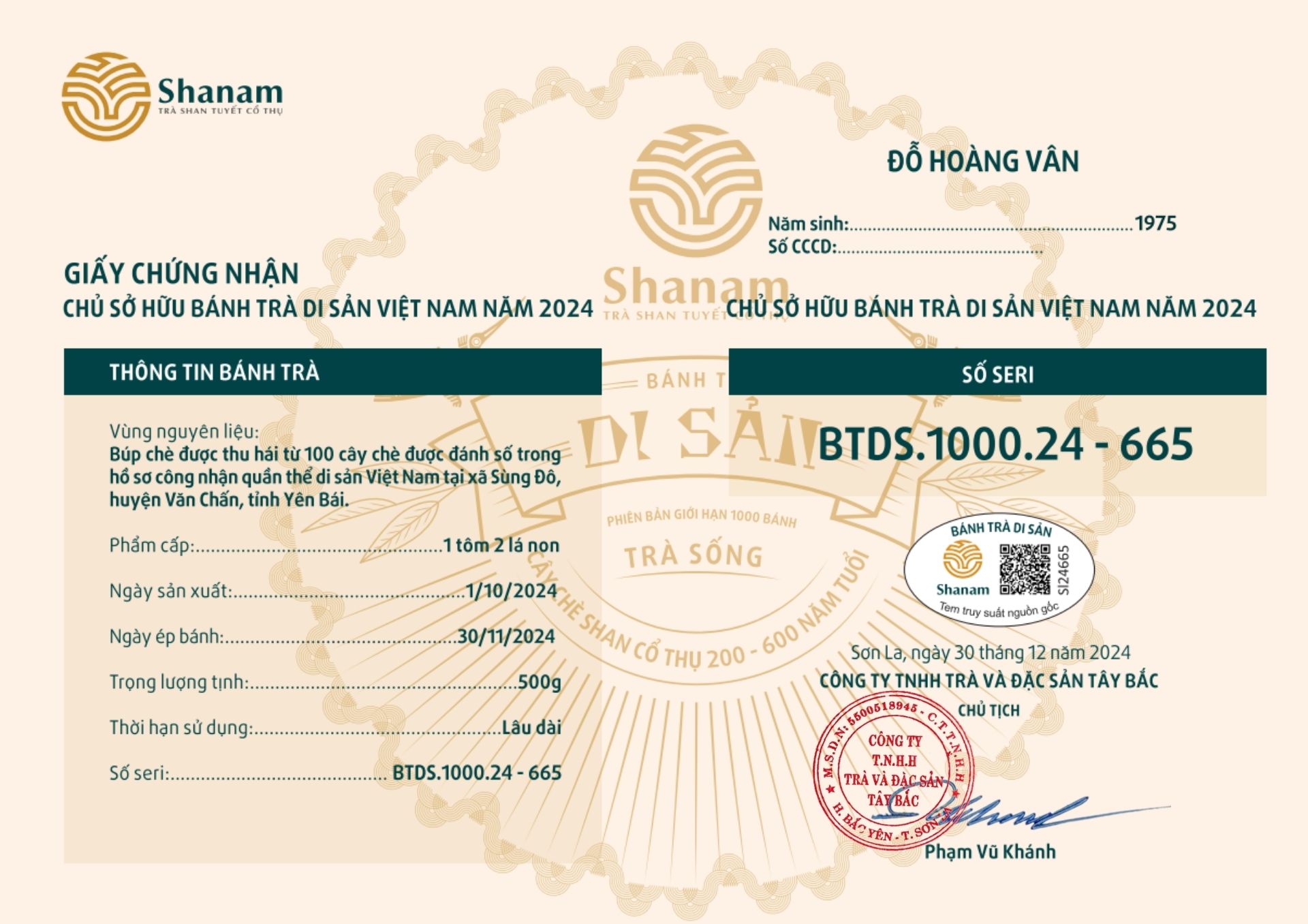 Bánh trà Di sản Việt Nam năm 2023 sản xuất số lượng giới hạn 500 bánh, được đánh mã số từng bánh trà theo thứ tự từ 1 – 500 và có chữ ký trực tiếp của người sáng lập thương hiệu trà Shanam Phạm Vũ Khánh trên từng bánh trà. Mỗi bánh trà có QR riêng truy suất về website www.shanam.com.vn chứng minh chủ sở hữu của bánh trà.