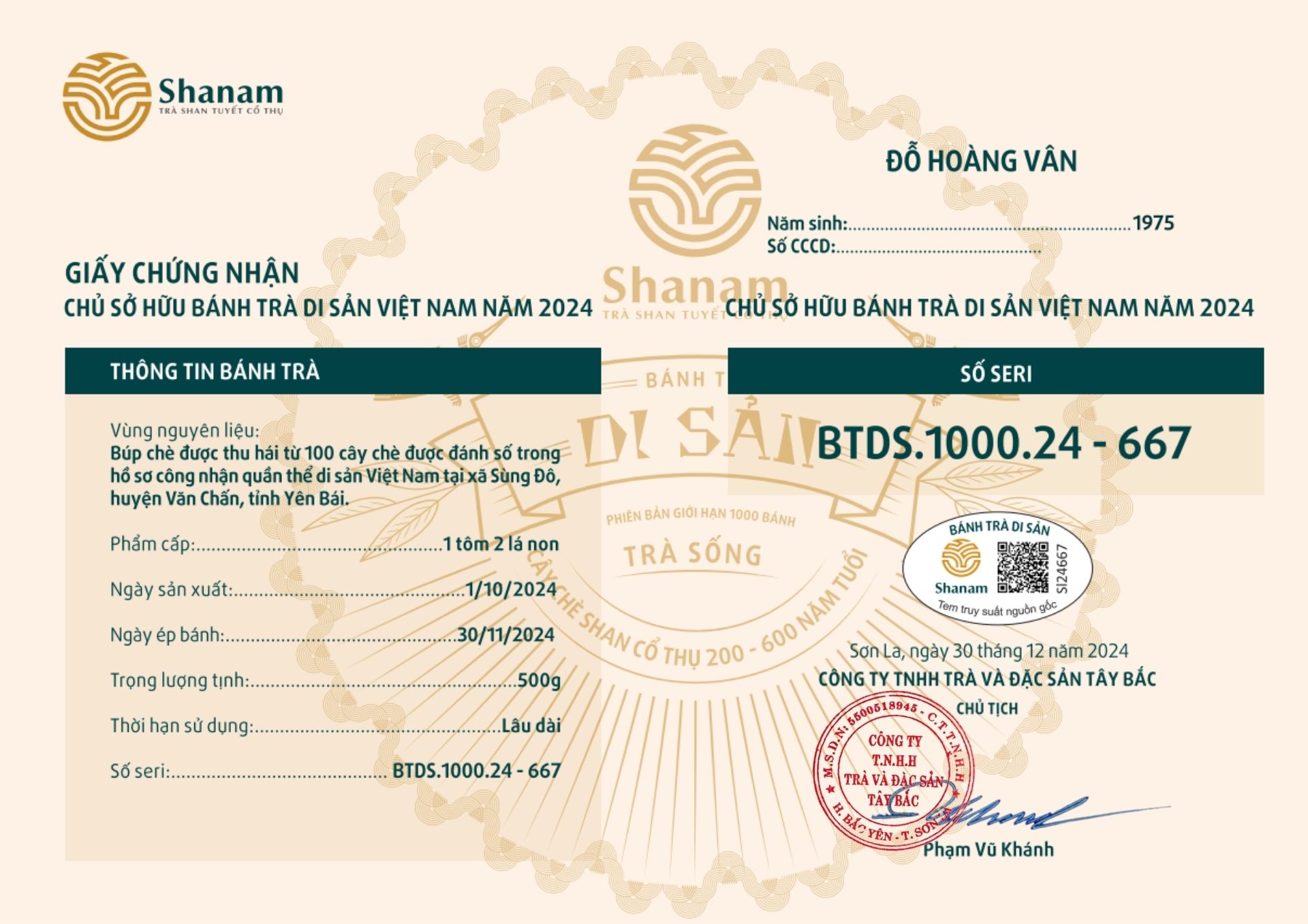 Bánh trà Di sản Việt Nam năm 2023 sản xuất số lượng giới hạn 500 bánh, được đánh mã số từng bánh trà theo thứ tự từ 1 – 500 và có chữ ký trực tiếp của người sáng lập thương hiệu trà Shanam Phạm Vũ Khánh trên từng bánh trà. Mỗi bánh trà có QR riêng truy suất về website www.shanam.com.vn chứng minh chủ sở hữu của bánh trà.