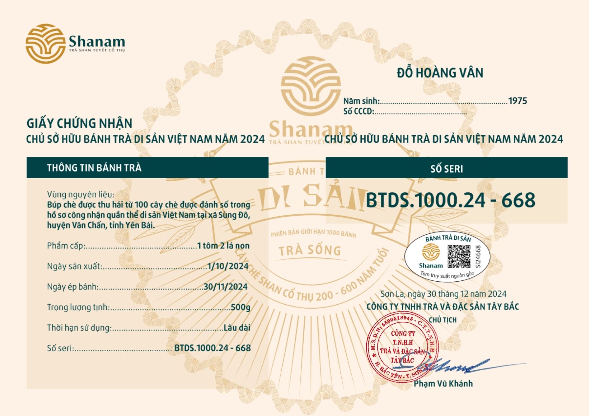 Bánh trà Di sản Việt Nam năm 2023 sản xuất số lượng giới hạn 500 bánh, được đánh mã số từng bánh trà theo thứ tự từ 1 – 500 và có chữ ký trực tiếp của người sáng lập thương hiệu trà Shanam Phạm Vũ Khánh trên từng bánh trà. Mỗi bánh trà có QR riêng truy suất về website www.shanam.com.vn chứng minh chủ sở hữu của bánh trà.