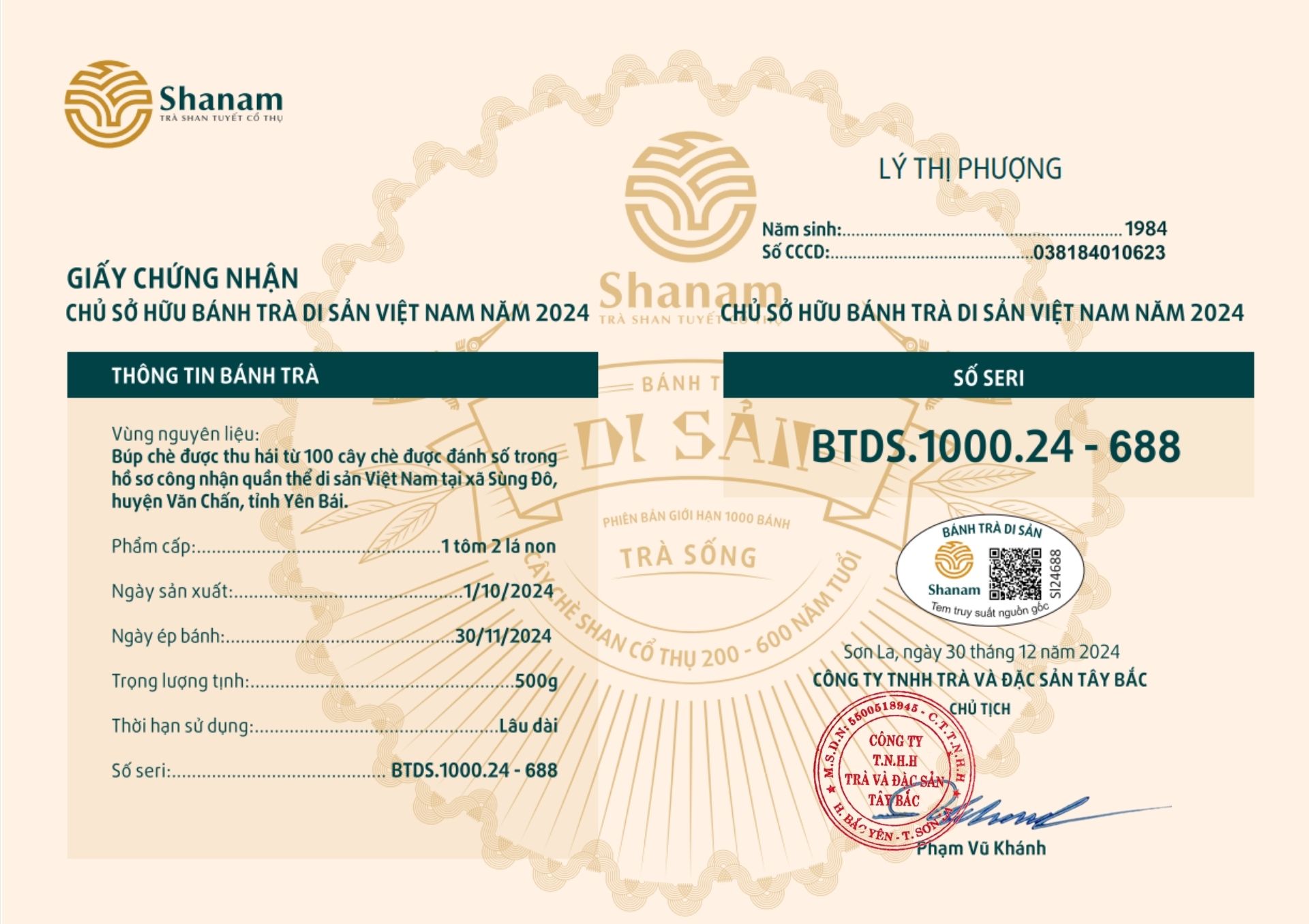 Bánh trà Di sản Việt Nam năm 2023 sản xuất số lượng giới hạn 500 bánh, được đánh mã số từng bánh trà theo thứ tự từ 1 – 500 và có chữ ký trực tiếp của người sáng lập thương hiệu trà Shanam Phạm Vũ Khánh trên từng bánh trà. Mỗi bánh trà có QR riêng truy suất về website www.shanam.com.vn chứng minh chủ sở hữu của bánh trà.
