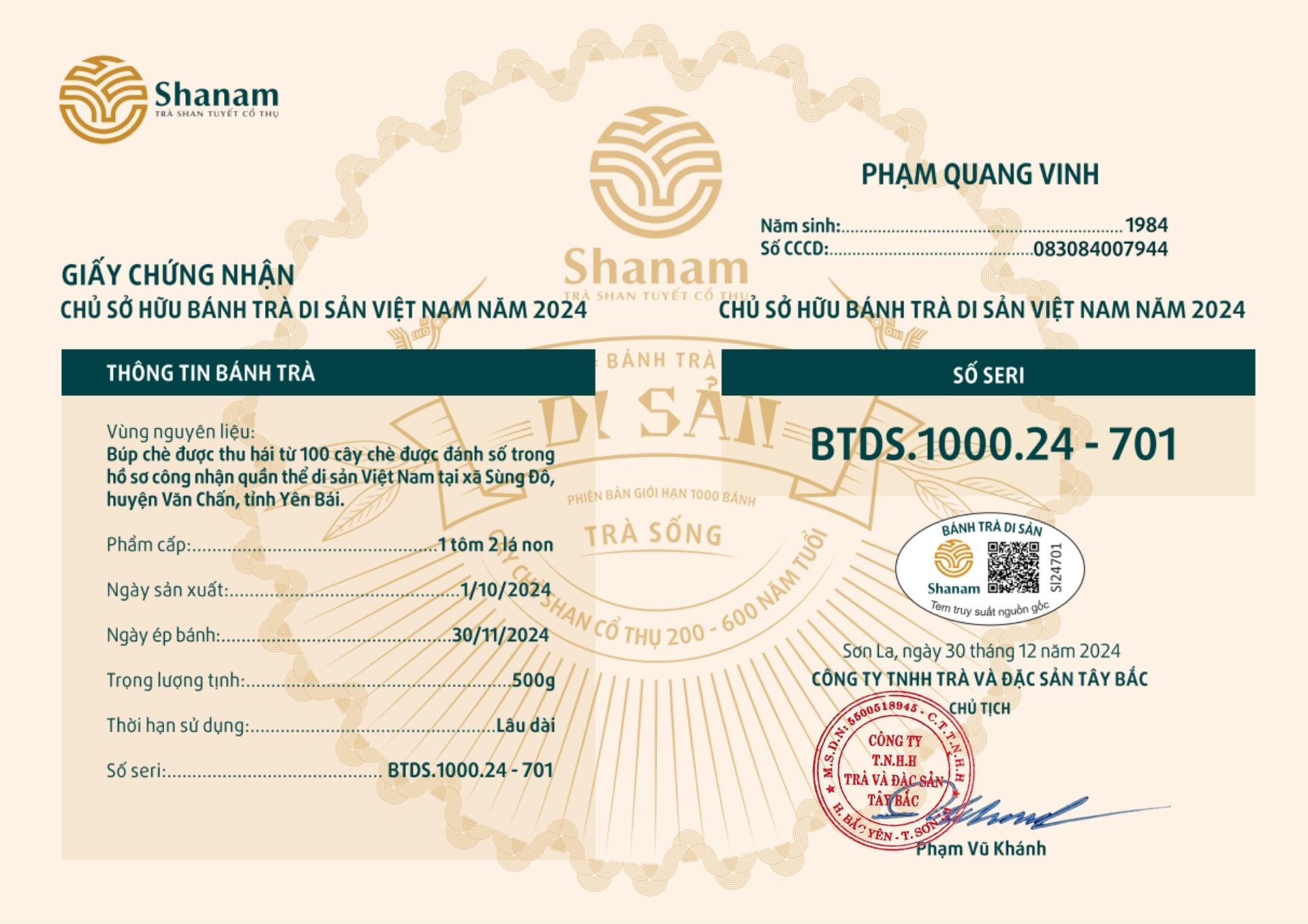Bánh trà Di sản Việt Nam năm 2023 sản xuất số lượng giới hạn 500 bánh, được đánh mã số từng bánh trà theo thứ tự từ 1 – 500 và có chữ ký trực tiếp của người sáng lập thương hiệu trà Shanam Phạm Vũ Khánh trên từng bánh trà. Mỗi bánh trà có QR riêng truy suất về website www.shanam.com.vn chứng minh chủ sở hữu của bánh trà.