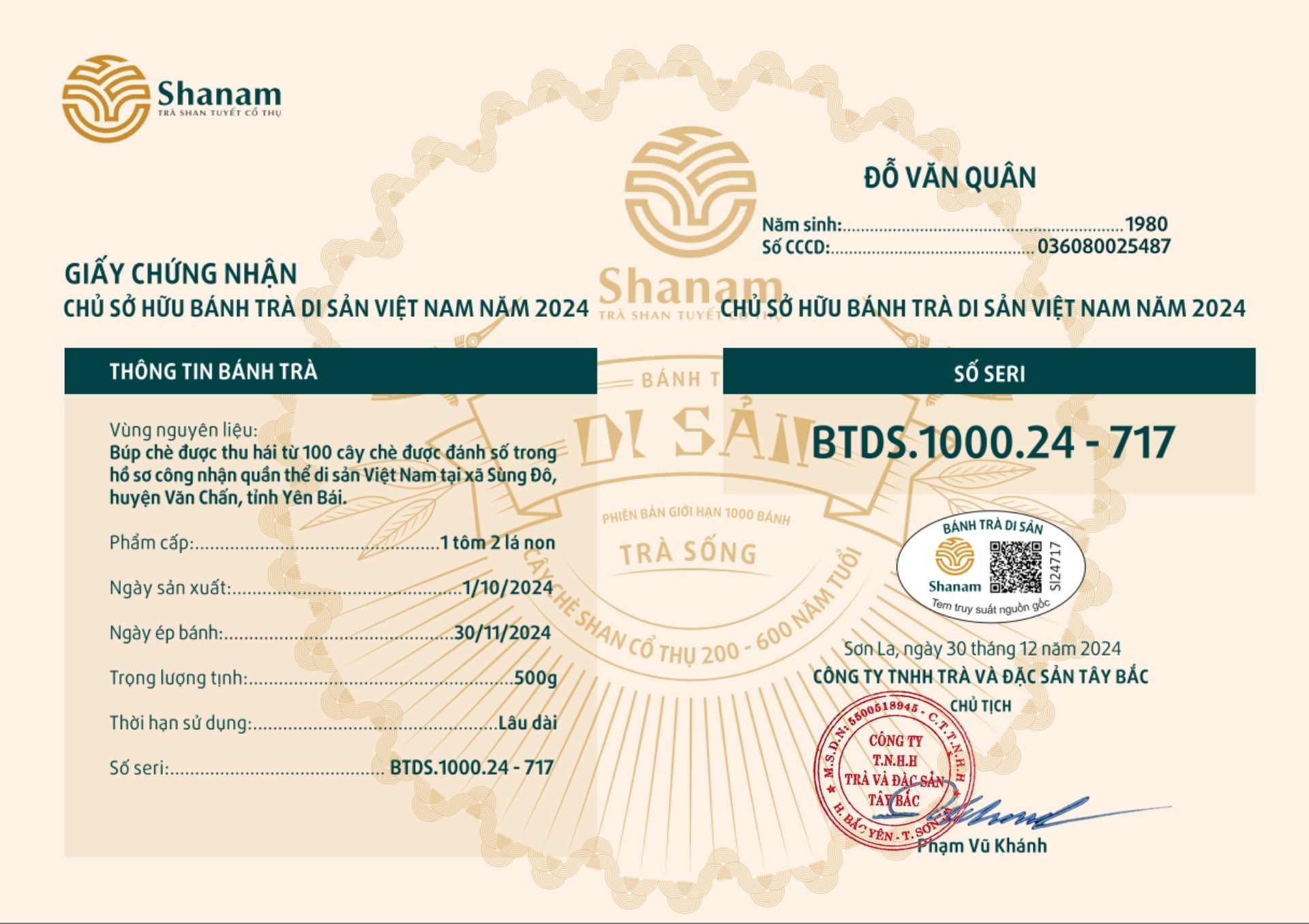 Bánh trà Di sản Việt Nam năm 2023 sản xuất số lượng giới hạn 500 bánh, được đánh mã số từng bánh trà theo thứ tự từ 1 – 500 và có chữ ký trực tiếp của người sáng lập thương hiệu trà Shanam Phạm Vũ Khánh trên từng bánh trà. Mỗi bánh trà có QR riêng truy suất về website www.shanam.com.vn chứng minh chủ sở hữu của bánh trà.