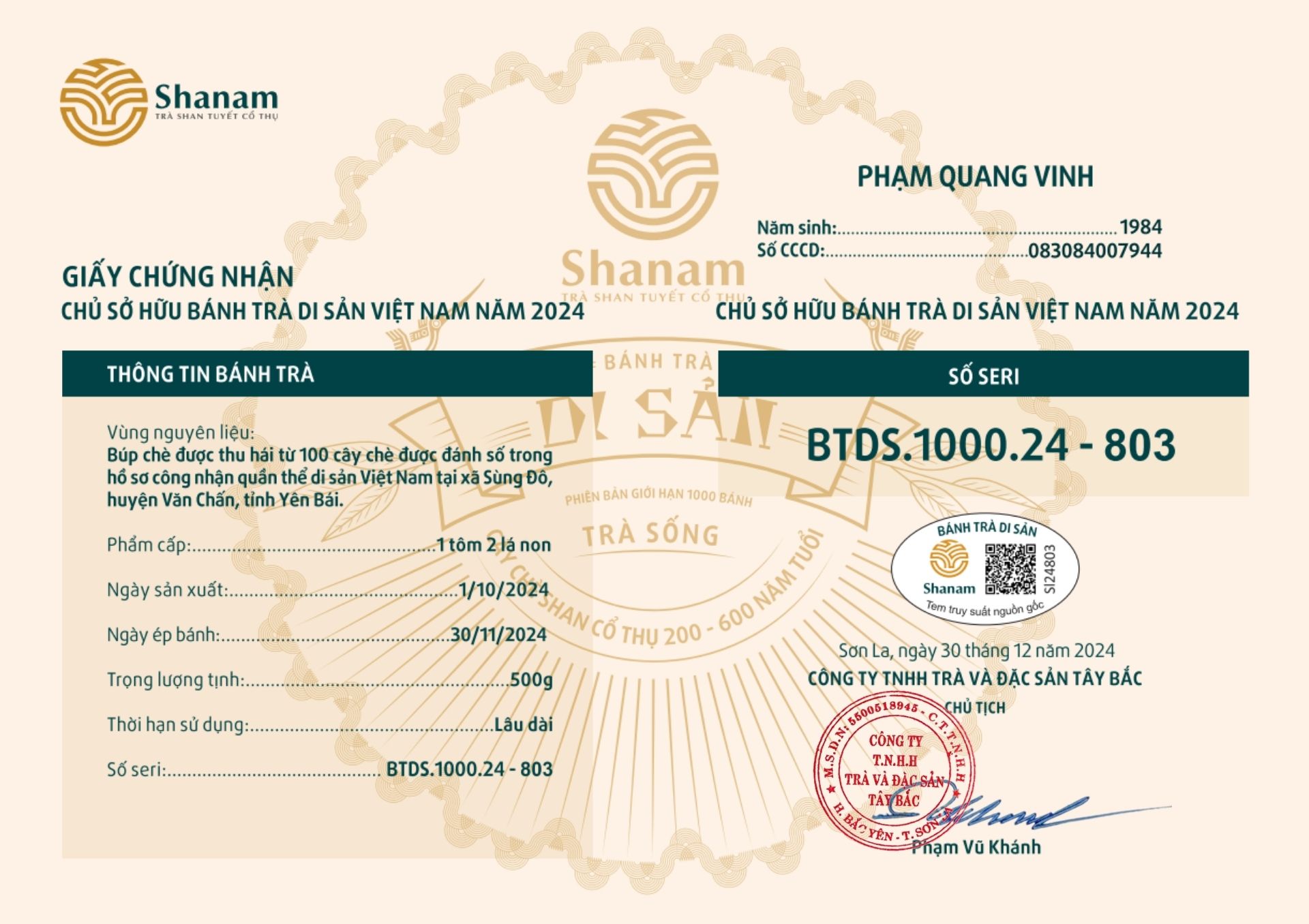 Bánh trà Di sản Việt Nam năm 2023 sản xuất số lượng giới hạn 500 bánh, được đánh mã số từng bánh trà theo thứ tự từ 1 – 500 và có chữ ký trực tiếp của người sáng lập thương hiệu trà Shanam Phạm Vũ Khánh trên từng bánh trà. Mỗi bánh trà có QR riêng truy suất về website www.shanam.com.vn chứng minh chủ sở hữu của bánh trà.