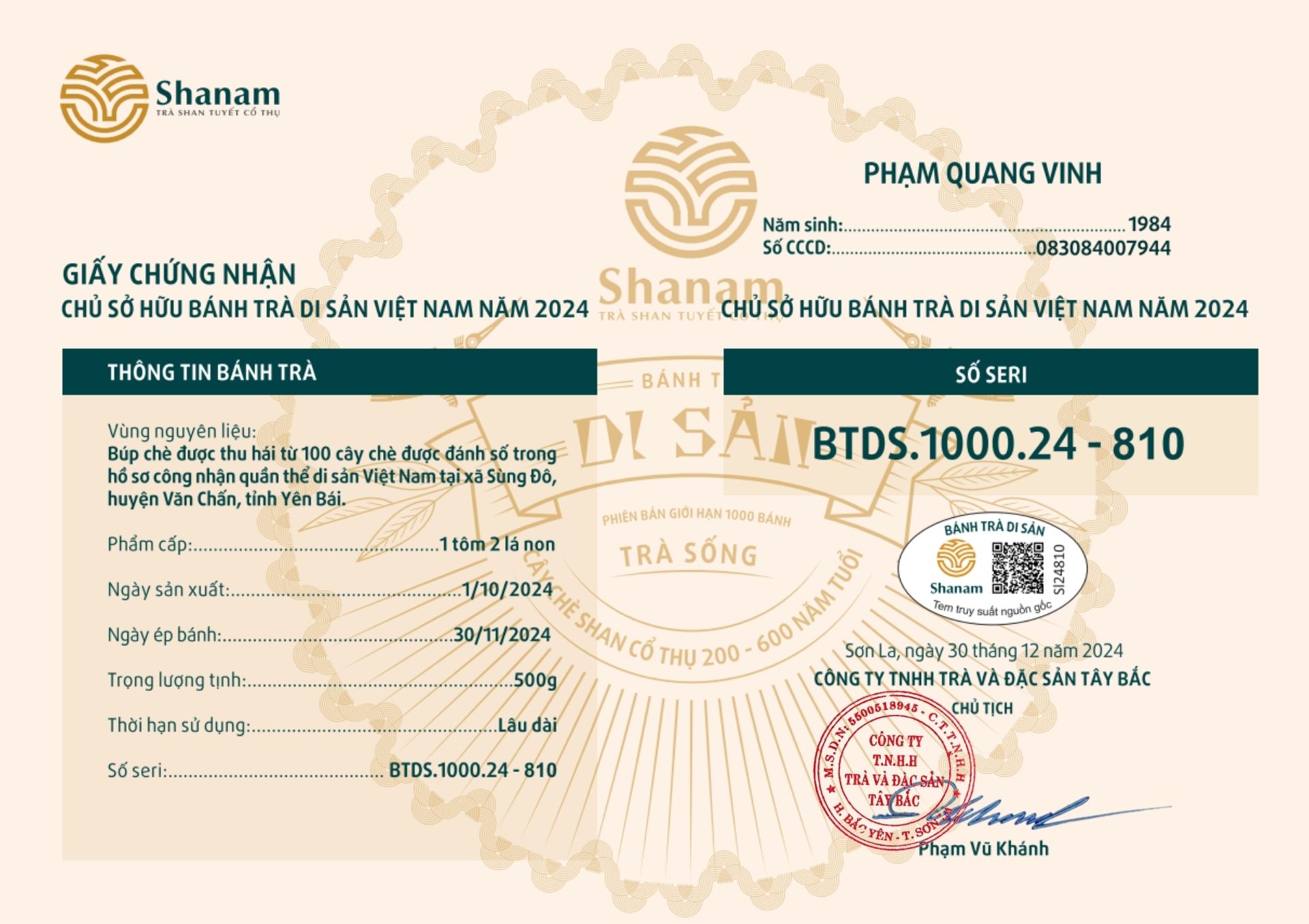 Bánh trà Di sản Việt Nam năm 2023 sản xuất số lượng giới hạn 500 bánh, được đánh mã số từng bánh trà theo thứ tự từ 1 – 500 và có chữ ký trực tiếp của người sáng lập thương hiệu trà Shanam Phạm Vũ Khánh trên từng bánh trà. Mỗi bánh trà có QR riêng truy suất về website www.shanam.com.vn chứng minh chủ sở hữu của bánh trà.