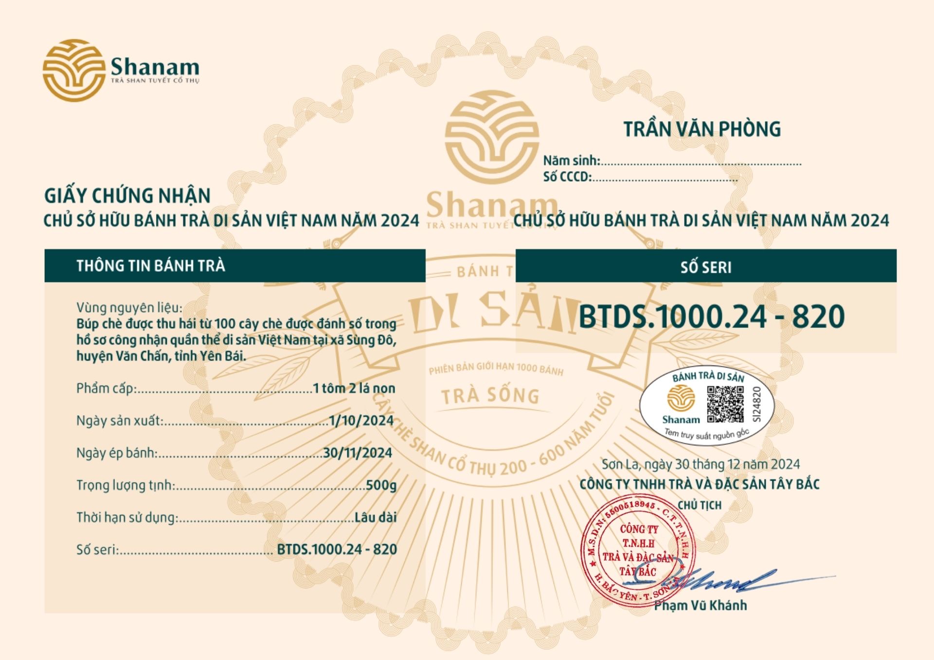 Bánh trà Di sản Việt Nam năm 2023 sản xuất số lượng giới hạn 500 bánh, được đánh mã số từng bánh trà theo thứ tự từ 1 – 500 và có chữ ký trực tiếp của người sáng lập thương hiệu trà Shanam Phạm Vũ Khánh trên từng bánh trà. Mỗi bánh trà có QR riêng truy suất về website www.shanam.com.vn chứng minh chủ sở hữu của bánh trà.