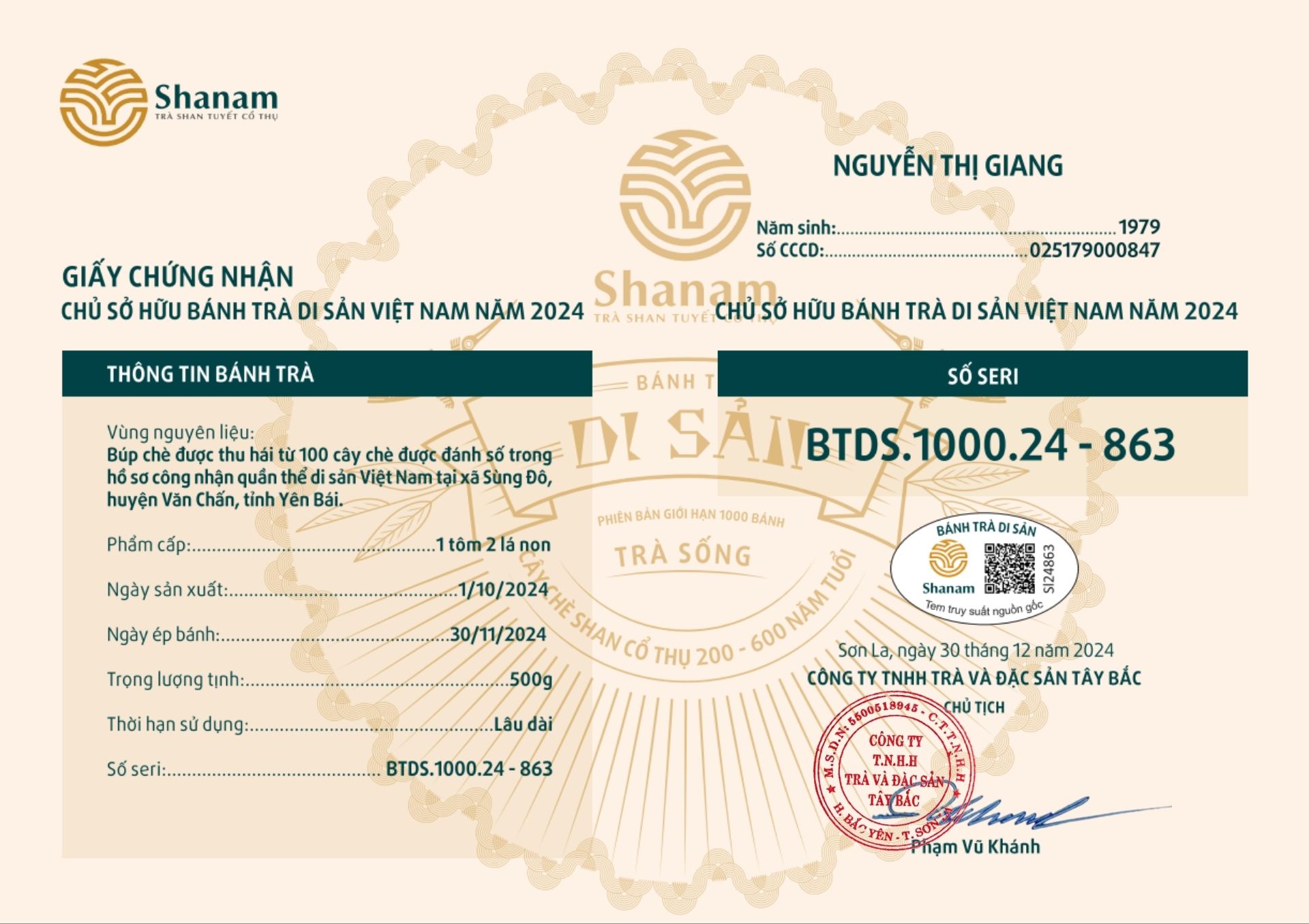 Bánh trà Di sản Việt Nam năm 2023 sản xuất số lượng giới hạn 500 bánh, được đánh mã số từng bánh trà theo thứ tự từ 1 – 500 và có chữ ký trực tiếp của người sáng lập thương hiệu trà Shanam Phạm Vũ Khánh trên từng bánh trà. Mỗi bánh trà có QR riêng truy suất về website www.shanam.com.vn chứng minh chủ sở hữu của bánh trà.