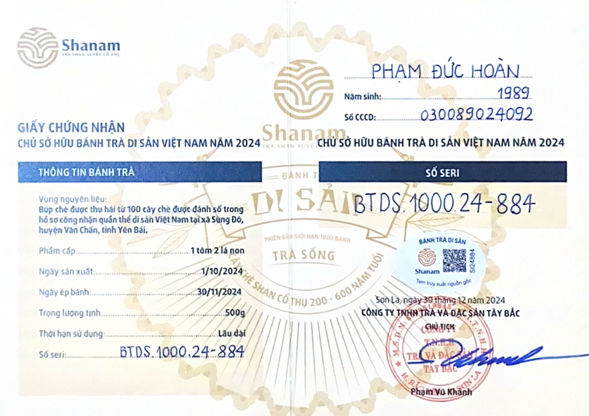 Bánh trà Di sản Việt Nam năm 2023 sản xuất số lượng giới hạn 500 bánh, được đánh mã số từng bánh trà theo thứ tự từ 1 – 500 và có chữ ký trực tiếp của người sáng lập thương hiệu trà Shanam Phạm Vũ Khánh trên từng bánh trà. Mỗi bánh trà có QR riêng truy suất về website www.shanam.com.vn chứng minh chủ sở hữu của bánh trà.