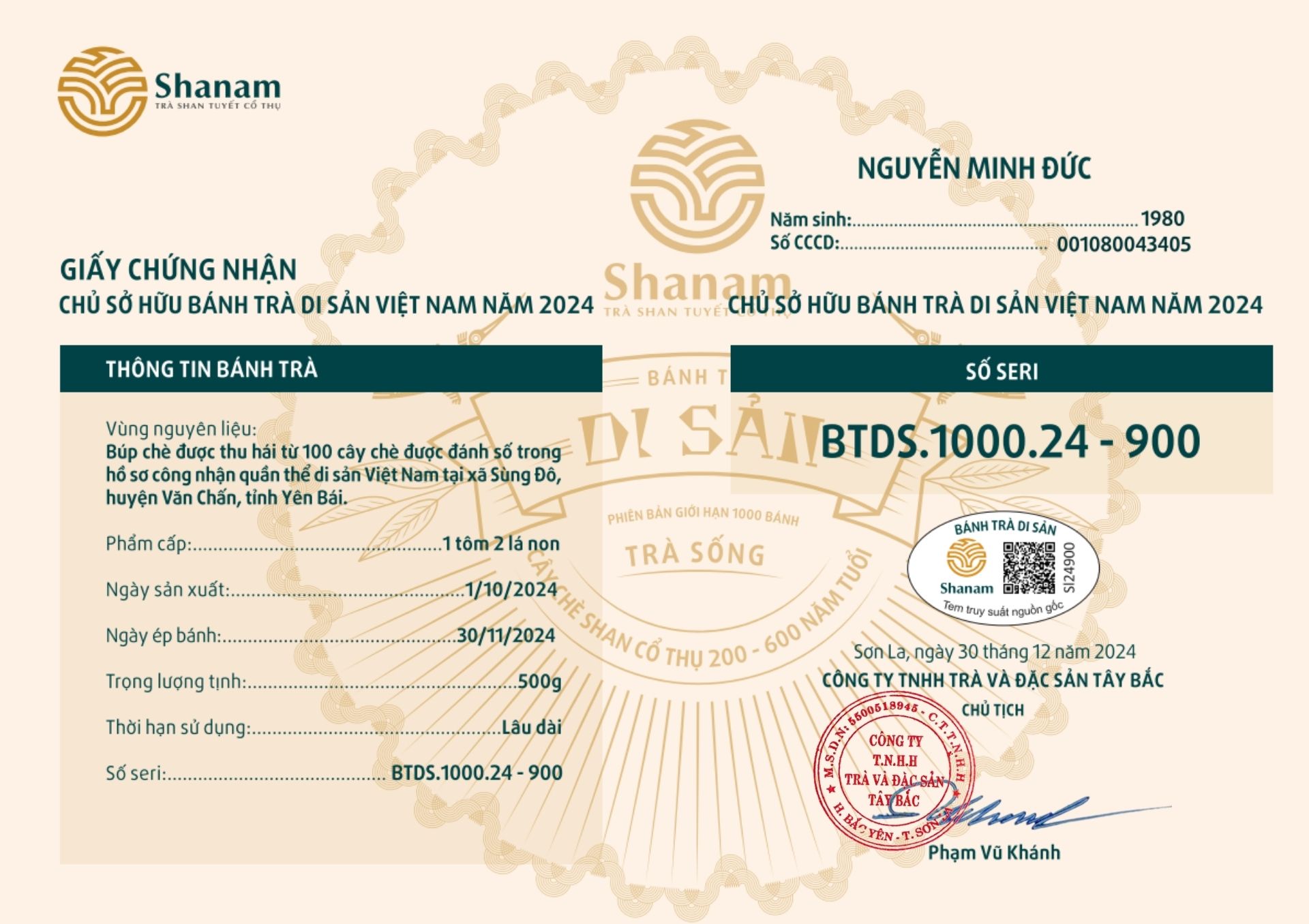 Bánh trà Di sản Việt Nam năm 2023 sản xuất số lượng giới hạn 500 bánh, được đánh mã số từng bánh trà theo thứ tự từ 1 – 500 và có chữ ký trực tiếp của người sáng lập thương hiệu trà Shanam Phạm Vũ Khánh trên từng bánh trà. Mỗi bánh trà có QR riêng truy suất về website www.shanam.com.vn chứng minh chủ sở hữu của bánh trà.