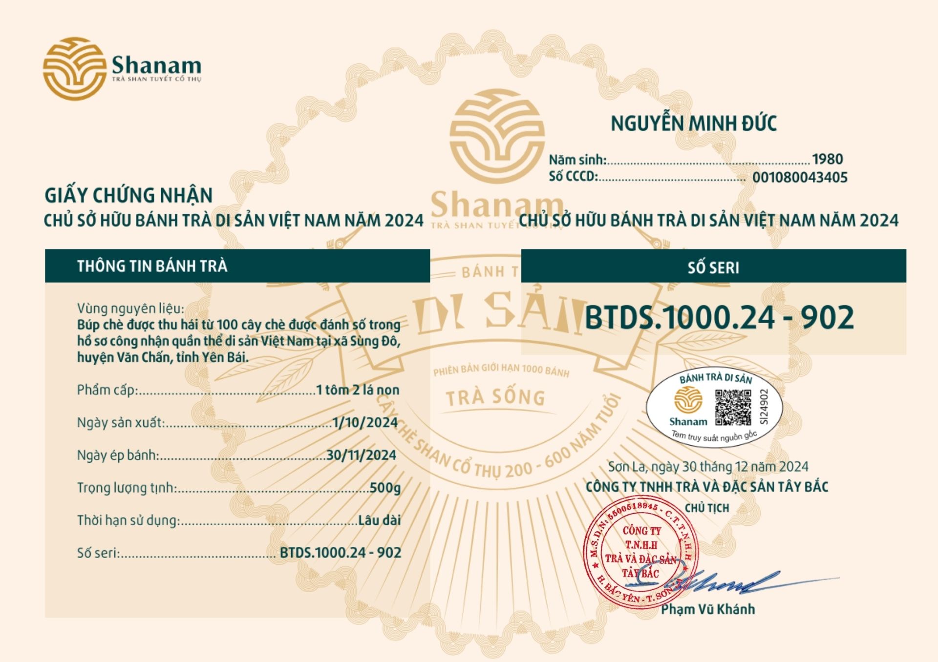 Bánh trà Di sản Việt Nam năm 2023 sản xuất số lượng giới hạn 500 bánh, được đánh mã số từng bánh trà theo thứ tự từ 1 – 500 và có chữ ký trực tiếp của người sáng lập thương hiệu trà Shanam Phạm Vũ Khánh trên từng bánh trà. Mỗi bánh trà có QR riêng truy suất về website www.shanam.com.vn chứng minh chủ sở hữu của bánh trà.