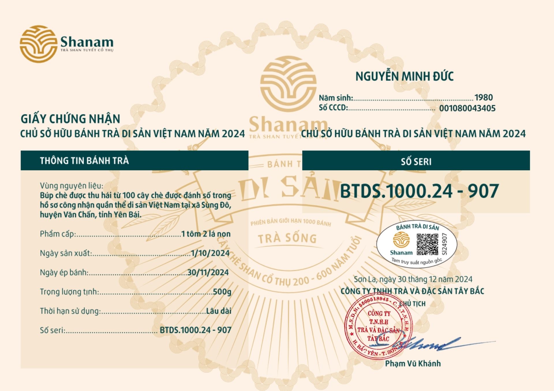Bánh trà Di sản Việt Nam năm 2023 sản xuất số lượng giới hạn 500 bánh, được đánh mã số từng bánh trà theo thứ tự từ 1 – 500 và có chữ ký trực tiếp của người sáng lập thương hiệu trà Shanam Phạm Vũ Khánh trên từng bánh trà. Mỗi bánh trà có QR riêng truy suất về website www.shanam.com.vn chứng minh chủ sở hữu của bánh trà.