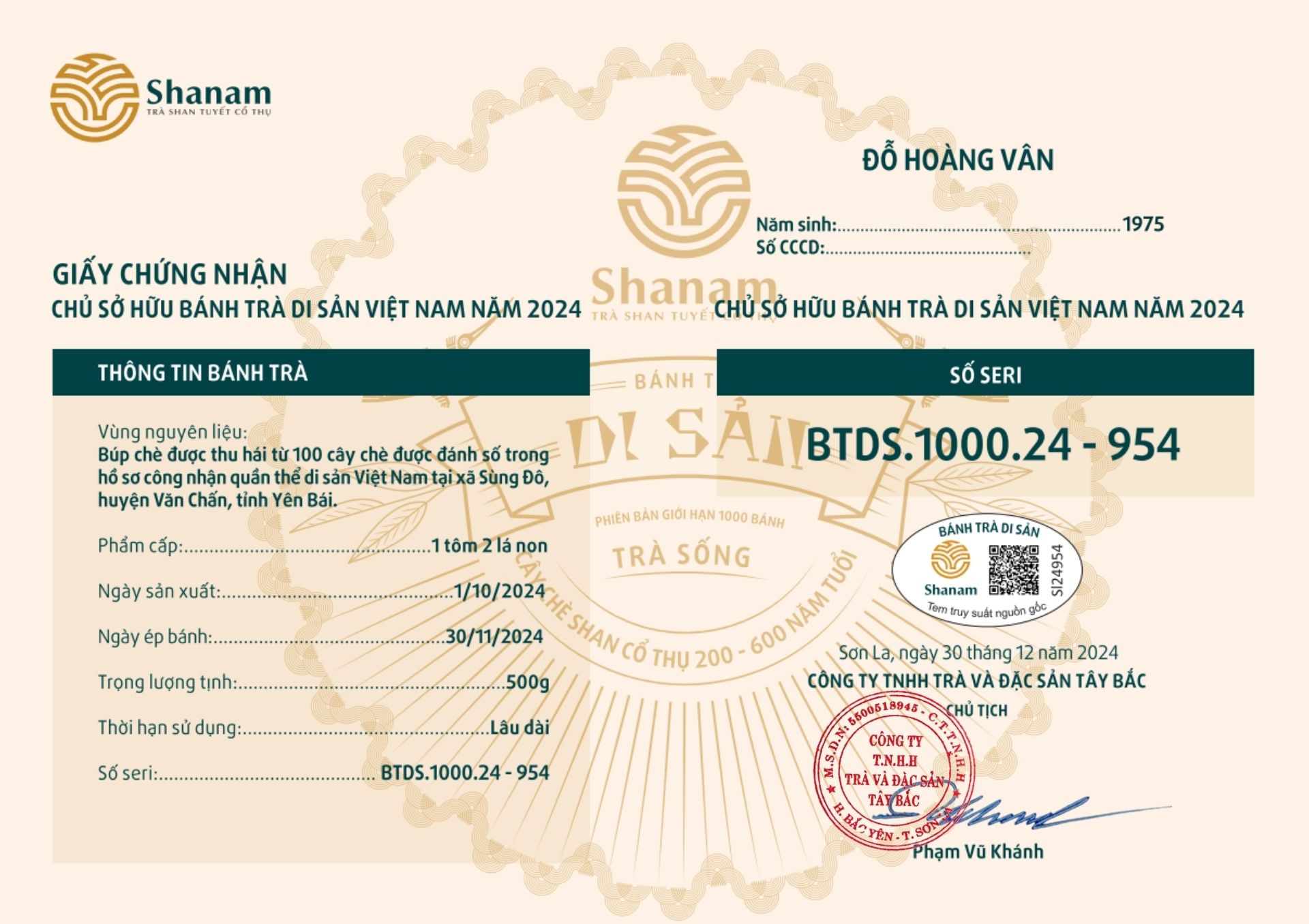 Bánh trà Di sản Việt Nam năm 2023 sản xuất số lượng giới hạn 500 bánh, được đánh mã số từng bánh trà theo thứ tự từ 1 – 500 và có chữ ký trực tiếp của người sáng lập thương hiệu trà Shanam Phạm Vũ Khánh trên từng bánh trà. Mỗi bánh trà có QR riêng truy suất về website www.shanam.com.vn chứng minh chủ sở hữu của bánh trà.