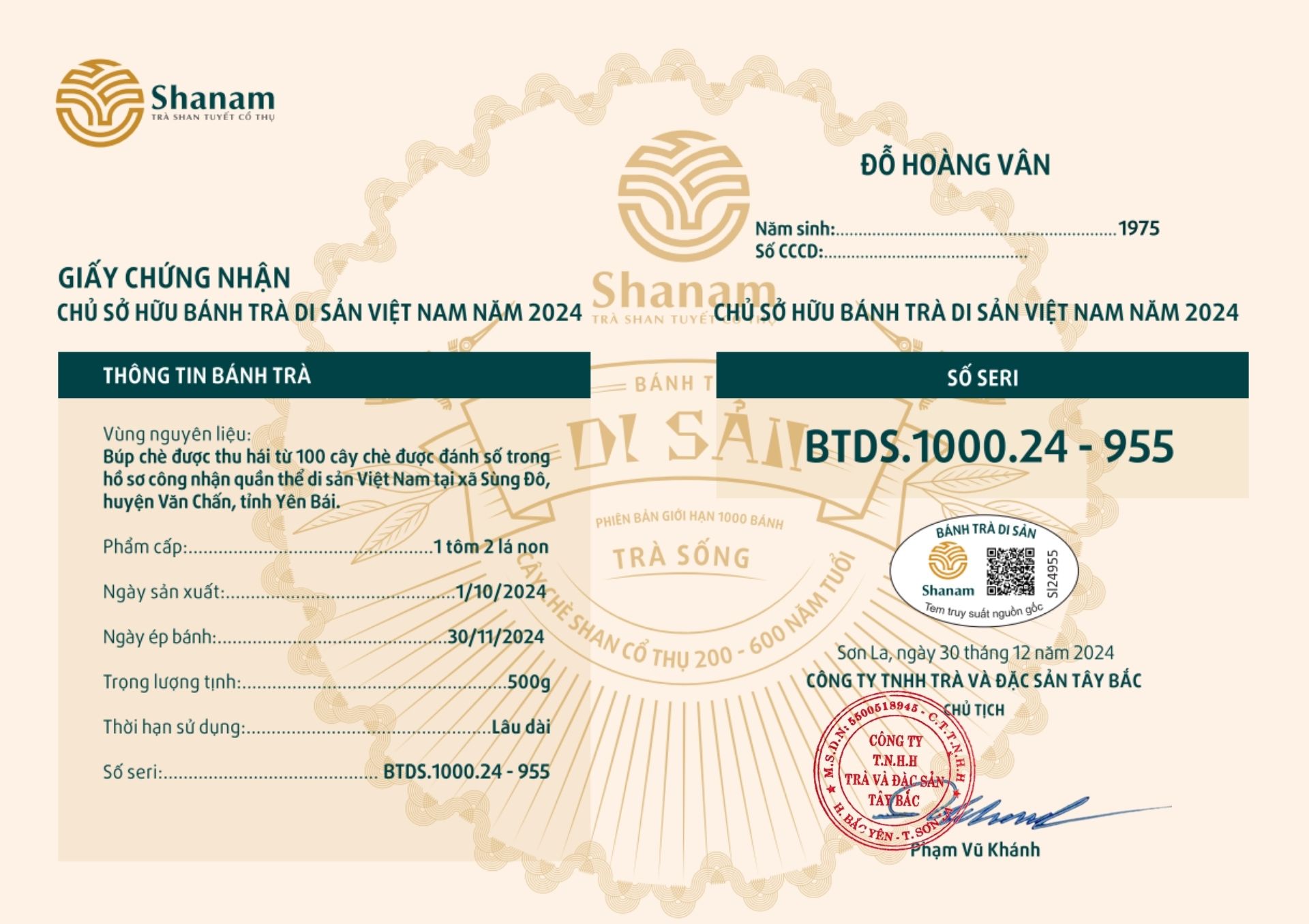 Bánh trà Di sản Việt Nam năm 2023 sản xuất số lượng giới hạn 500 bánh, được đánh mã số từng bánh trà theo thứ tự từ 1 – 500 và có chữ ký trực tiếp của người sáng lập thương hiệu trà Shanam Phạm Vũ Khánh trên từng bánh trà. Mỗi bánh trà có QR riêng truy suất về website www.shanam.com.vn chứng minh chủ sở hữu của bánh trà.