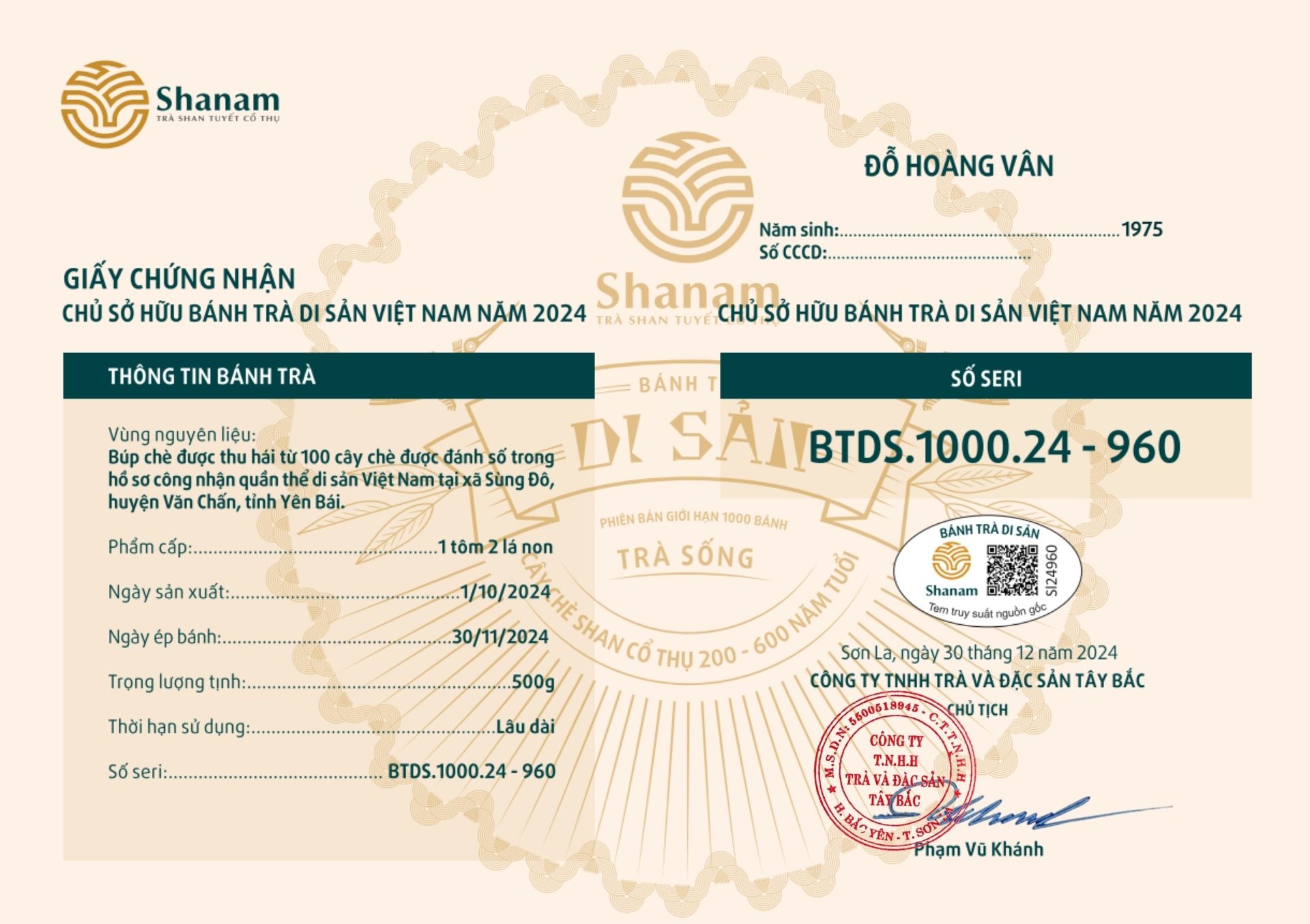 Bánh trà Di sản Việt Nam năm 2023 sản xuất số lượng giới hạn 500 bánh, được đánh mã số từng bánh trà theo thứ tự từ 1 – 500 và có chữ ký trực tiếp của người sáng lập thương hiệu trà Shanam Phạm Vũ Khánh trên từng bánh trà. Mỗi bánh trà có QR riêng truy suất về website www.shanam.com.vn chứng minh chủ sở hữu của bánh trà.