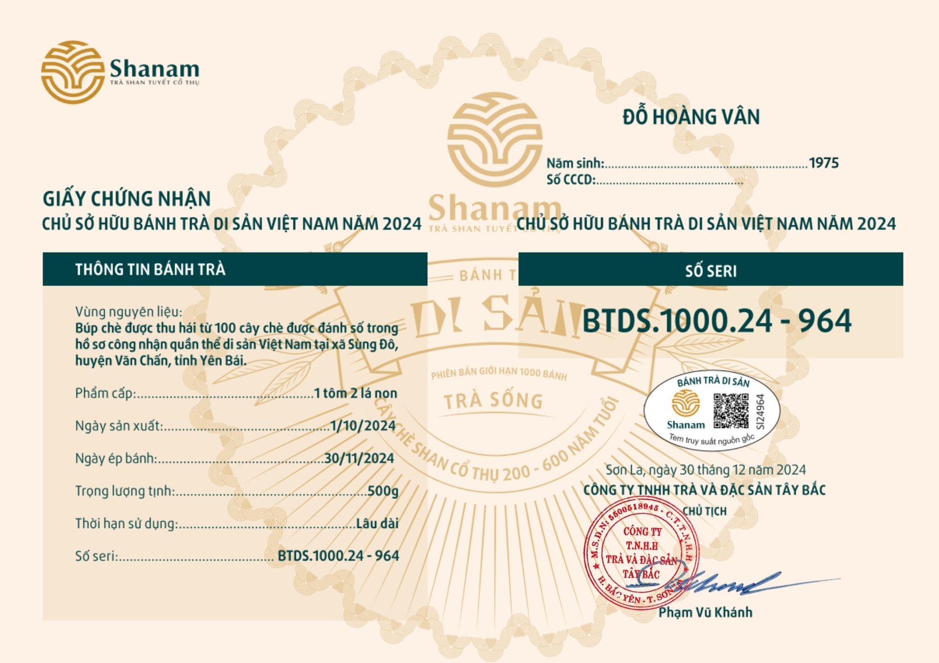 Bánh trà Di sản Việt Nam năm 2023 sản xuất số lượng giới hạn 500 bánh, được đánh mã số từng bánh trà theo thứ tự từ 1 – 500 và có chữ ký trực tiếp của người sáng lập thương hiệu trà Shanam Phạm Vũ Khánh trên từng bánh trà. Mỗi bánh trà có QR riêng truy suất về website www.shanam.com.vn chứng minh chủ sở hữu của bánh trà.