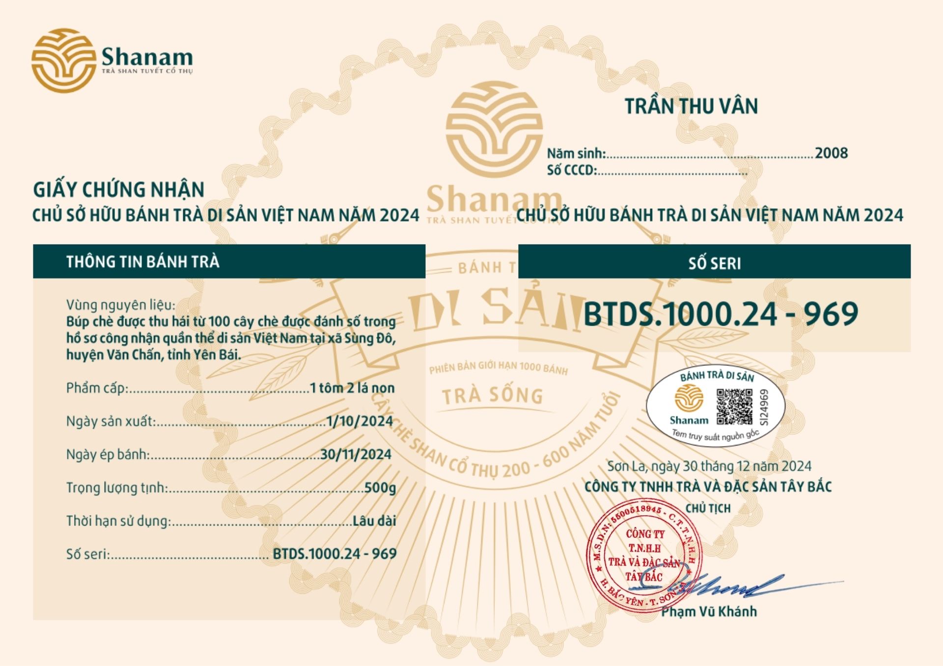 Bánh trà Di sản Việt Nam năm 2023 sản xuất số lượng giới hạn 500 bánh, được đánh mã số từng bánh trà theo thứ tự từ 1 – 500 và có chữ ký trực tiếp của người sáng lập thương hiệu trà Shanam Phạm Vũ Khánh trên từng bánh trà. Mỗi bánh trà có QR riêng truy suất về website www.shanam.com.vn chứng minh chủ sở hữu của bánh trà.
