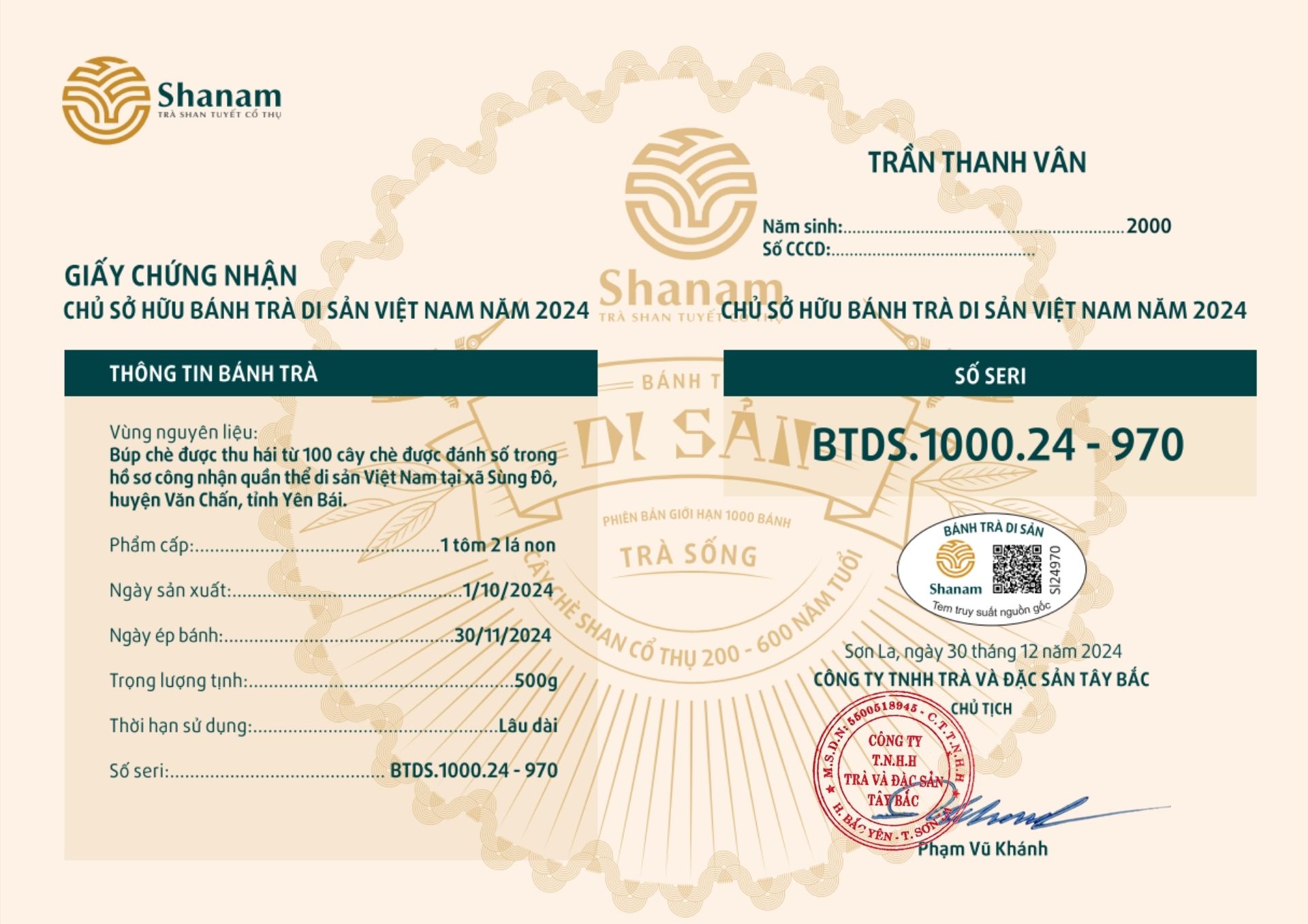 Bánh trà Di sản Việt Nam năm 2023 sản xuất số lượng giới hạn 500 bánh, được đánh mã số từng bánh trà theo thứ tự từ 1 – 500 và có chữ ký trực tiếp của người sáng lập thương hiệu trà Shanam Phạm Vũ Khánh trên từng bánh trà. Mỗi bánh trà có QR riêng truy suất về website www.shanam.com.vn chứng minh chủ sở hữu của bánh trà.